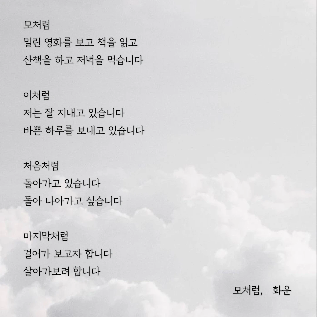 우연히 한 문장, 한 글자 주의 깊게 바라보았습니다. 그 우연이 제 삶에 길을 내어주었습니다. 제 글이 구름처럼 언제든 볼 수 있지만 깊이 있고 위로가 될 수 있으면 좋겠습니다