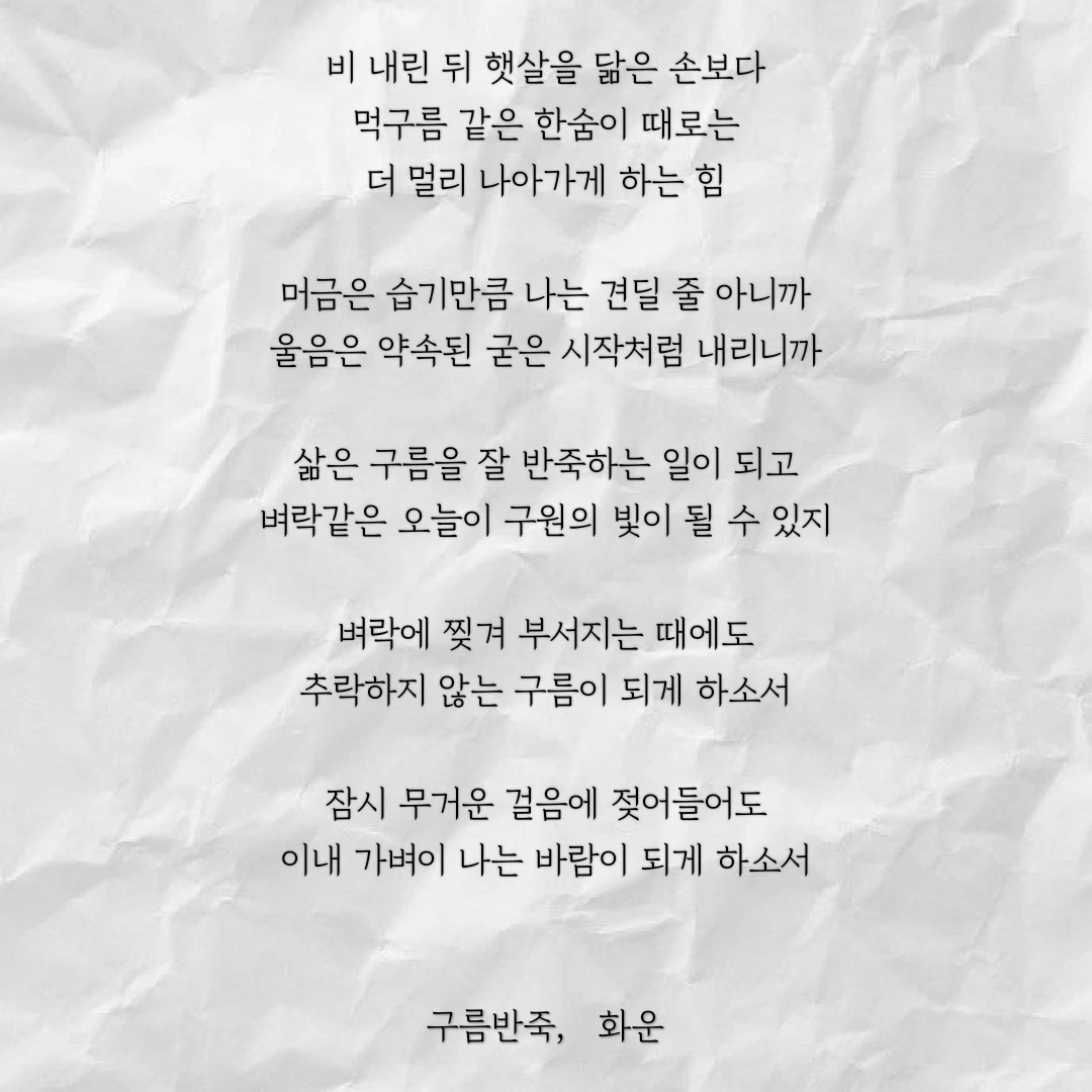 우연히 한 문장, 한 글자 주의 깊게 바라보았습니다. 그 우연이 제 삶에 길을 내어주었습니다. 제 글이 구름처럼 언제든 볼 수 있지만 깊이 있고 위로가 될 수 있으면 좋겠습니다