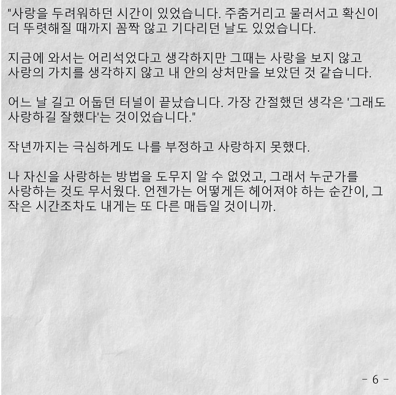 "사랑을 두려워하던 시간이 있었습니다. 주춤거리고 물러서고 확신이 더 또렷해질 때까지 꼼짝 않고 기다리던 날도 있었습니다. 지금에 와서는 어리석었다고 생각하지만 그때는 사랑을 보지 않고 사랑의 가치를 생각하지 않고 내 안의 상처만을 보았던 것 같습니다. 어느 날 길고 어둡던 터널이 끝났습니다. 가장 간절했던 생각은 '그래도 사랑하길 잘했다'는 것이었습니다."