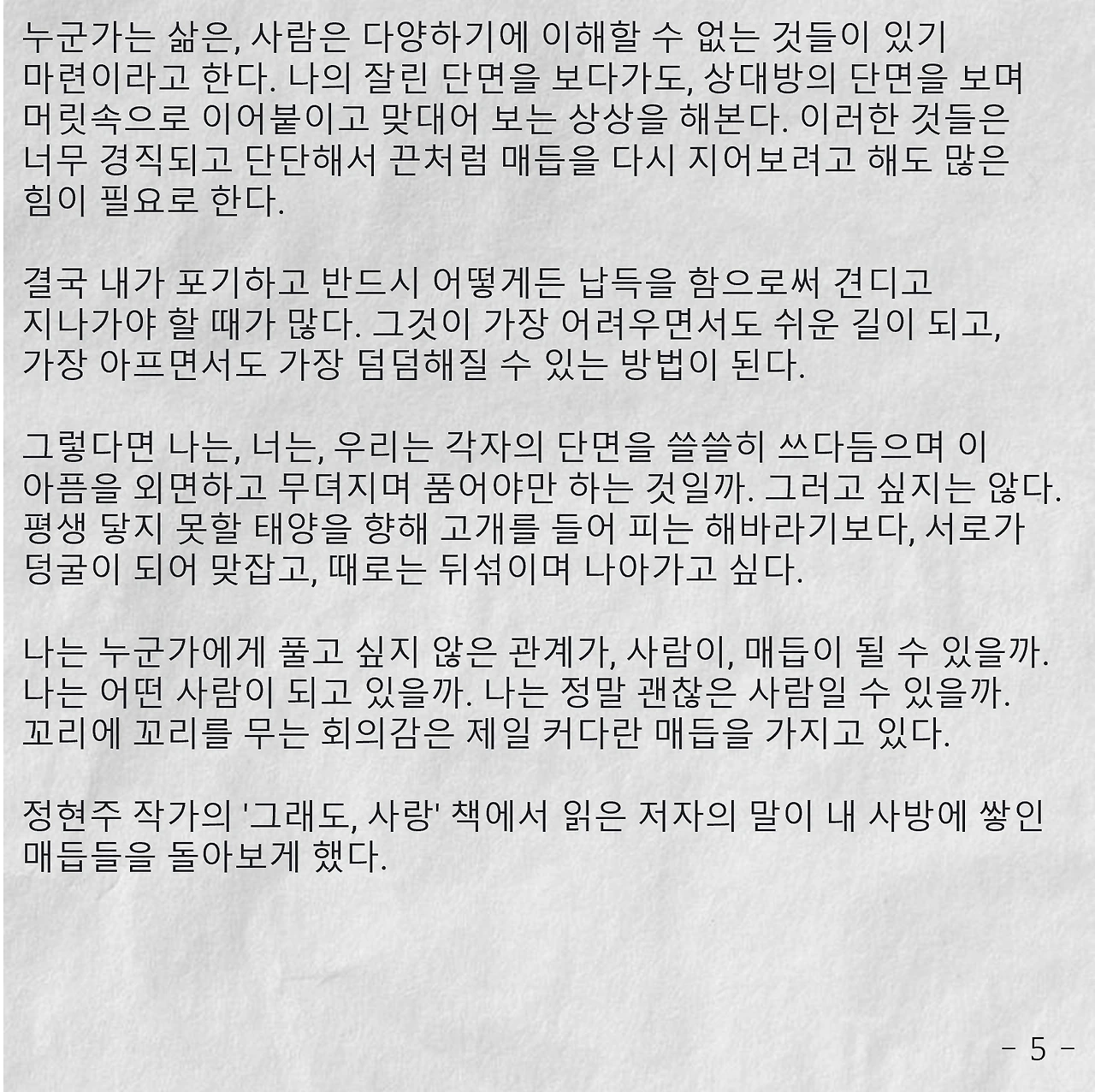 정현주 작가의 '그래도, 사랑' 책에서 읽은 저자의 말이 내 사방에 쌓인 매듭들을 돌아보게 했다.