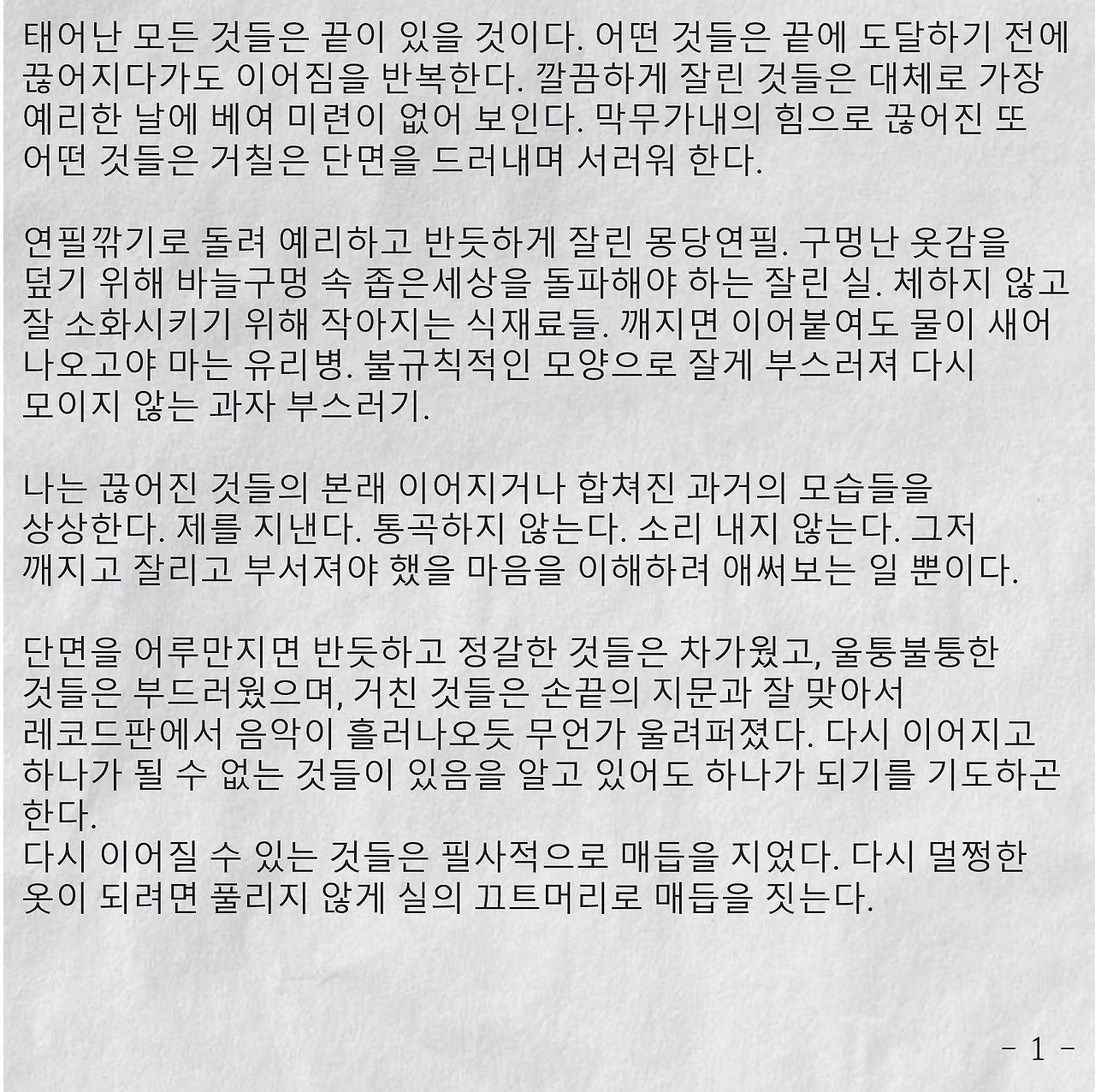 나는 끊어진 것들의 본래 이어지거나 합쳐진 과거의 모습들을 상상한다. 제를 지낸다. 통곡하지 않는다. 소리 내지 않는다. 그저 깨지고 잘리고 부서져야 했을 마음을 이해하려 애써보는 일 뿐이다.