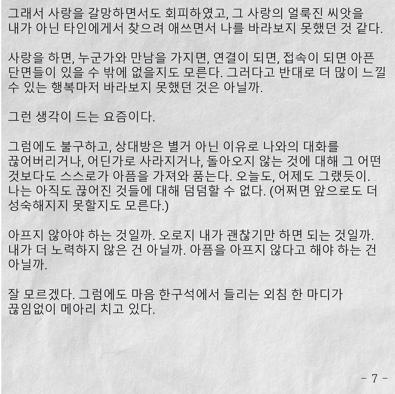 아프지 않아야 하는 것일까. 오로지 내가 괜찮기만 하면 되는 것일까. 내가 더 노력하지 않은 건 아닐까. 아픔을 아프지 않다고 해야 하는 건 아닐까.