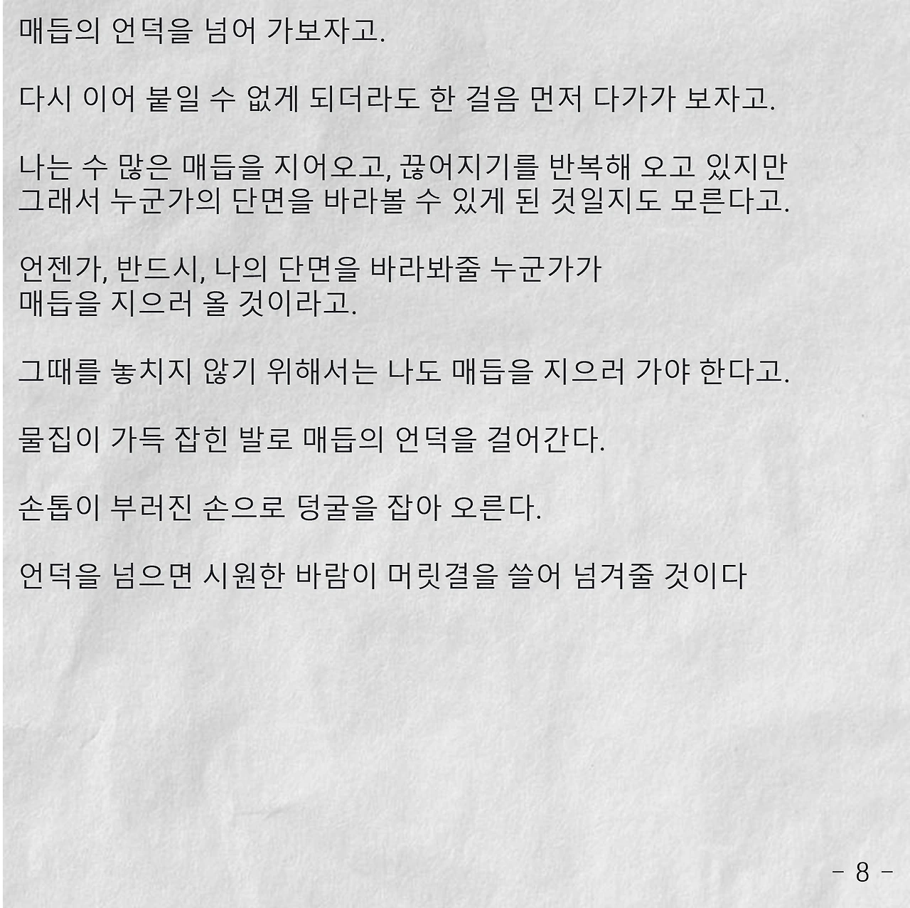 일방적인 매듭은 풀리기도 전에 또 다른 면이 잘려 도마뱀의 꼬리처럼 남겨지기도 한다. 내가 스스로 쉽게 풀 수 없는 것들은 하나둘 발끝에 채이다가도, 쌓여가면서 언덕이 되고, 산이 되어 내 앞을 가로막기도 한다.