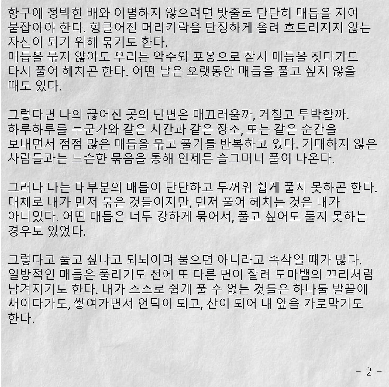 나는 누군가에게 풀고 싶지 않은 관계가, 사람이, 매듭이 될 수 있을까. 나는 어떤 사람이 되고 있을까. 나는 정말 괜찮은 사람일 수 있을까. 꼬리에 꼬리를 무는 회의감은 제일 커다란 매듭을 가지고 있다.