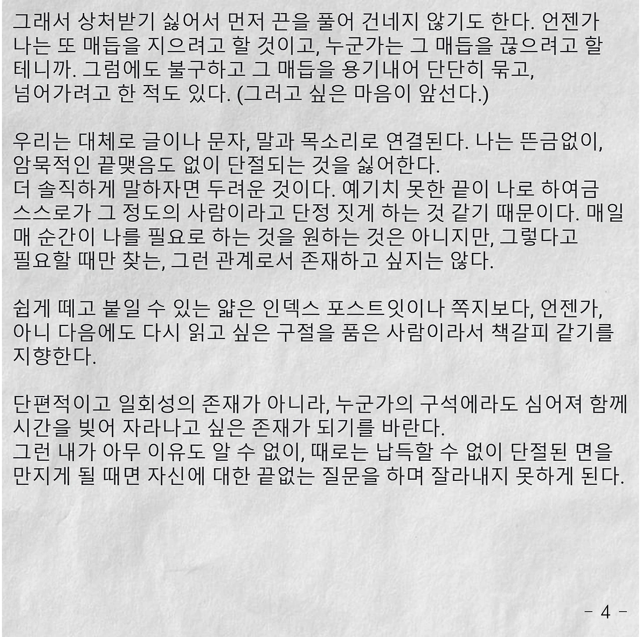 우리는 대체로 글이나 문자, 말과 목소리로 연결된다. 나는 뜬금없이, 암묵적인 끝맺음도 없이 단절되는 것을 싫어한다. 더 솔직하게 말하자면 두려운 것이다. 예기치 못한 끝이 나로 하여금 스스로가 그 정도의 사람이라고 단정 짓게 하는 것 같기 때문이다. 매일 매 순간이 나를 필요로 하는 것을 원하는 것은 아니지만, 그렇다고 필요할 때만 찾는, 그런 관계로서 존재하고 싶지는 않다.