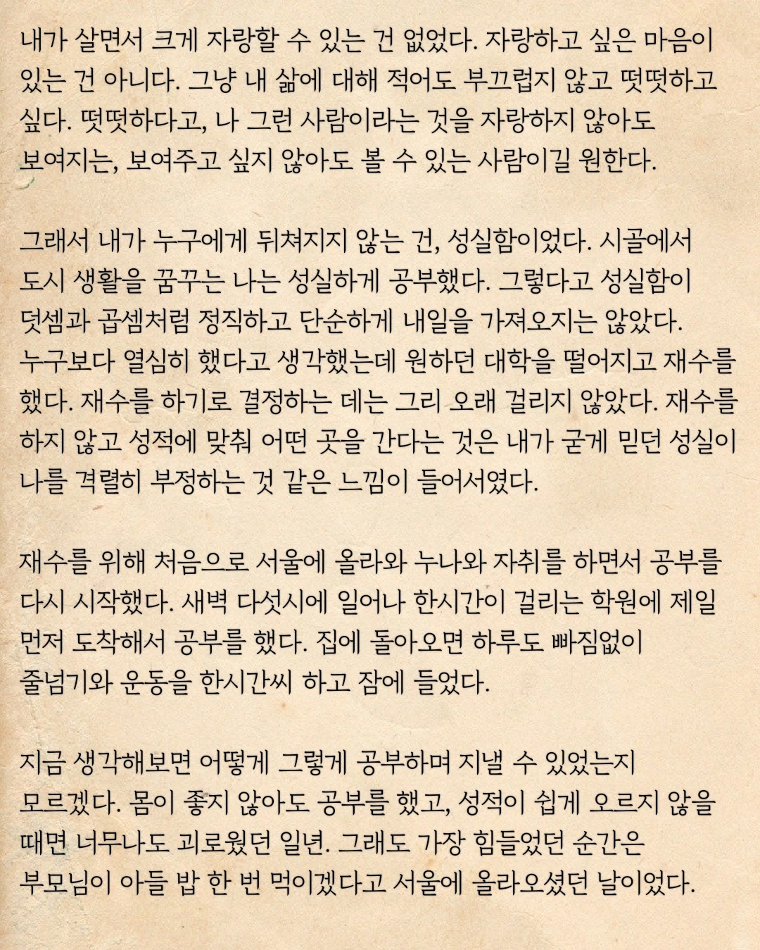 그래서 내가 누구에게 뒤쳐지지 않는 건, 성실함이었다. 시골에서 도시 생활을 꿈꾸는 나는 성실하게 공부했다. 그렇다고 성실함이 덧셈과 곱셈처럼 정직하고 단순하게 내일을 가져오지는 않았다. 누구보다 열심히 했다고 생각했는데 원하던 대학을 떨어지고 재수를 했다. 재수를 하기로 결정하는 데는 그리 오래 걸리지 않았다. 재수를 하지 않고 성적에 맞춰 어떤 곳을 간다는 것은 내가 굳게 믿던 성실이 나를 격렬히 부정하는 것 같은 느낌이 들어서였다.