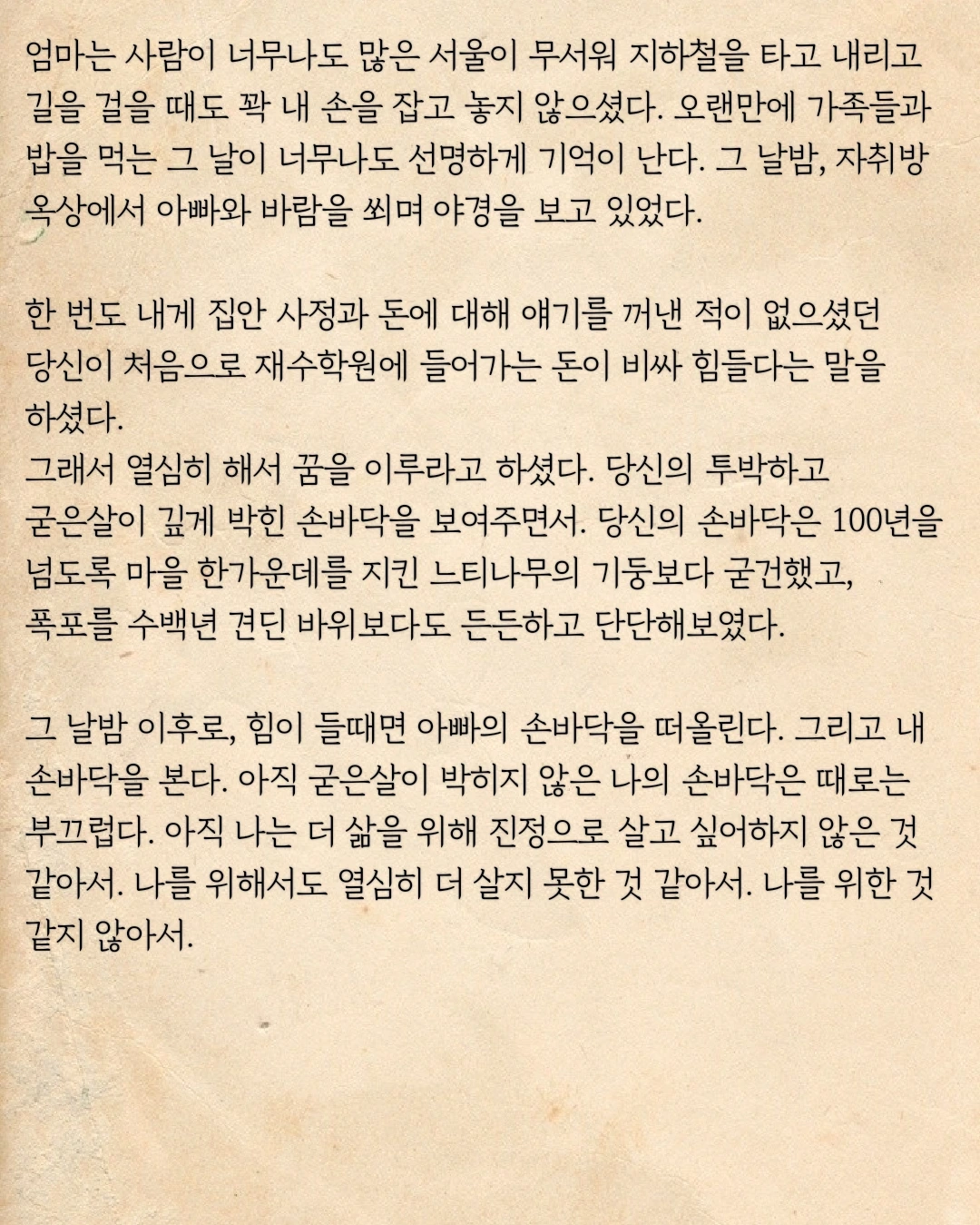 그 날밤 이후로, 힘이 들때면 아빠의 손바닥을 떠올린다. 그리고 내 손바닥을 본다. 아직 굳은살이 박히지 않은 나의 손바닥은 때로는 부끄럽다. 아직 나는 더 삶을 위해 진정으로 살고 싶어하지 않은 것 같아서. 나를 위해서도 열심히 더 살지 못한 것 같아서. 나를 위한 것 같지 않아서.