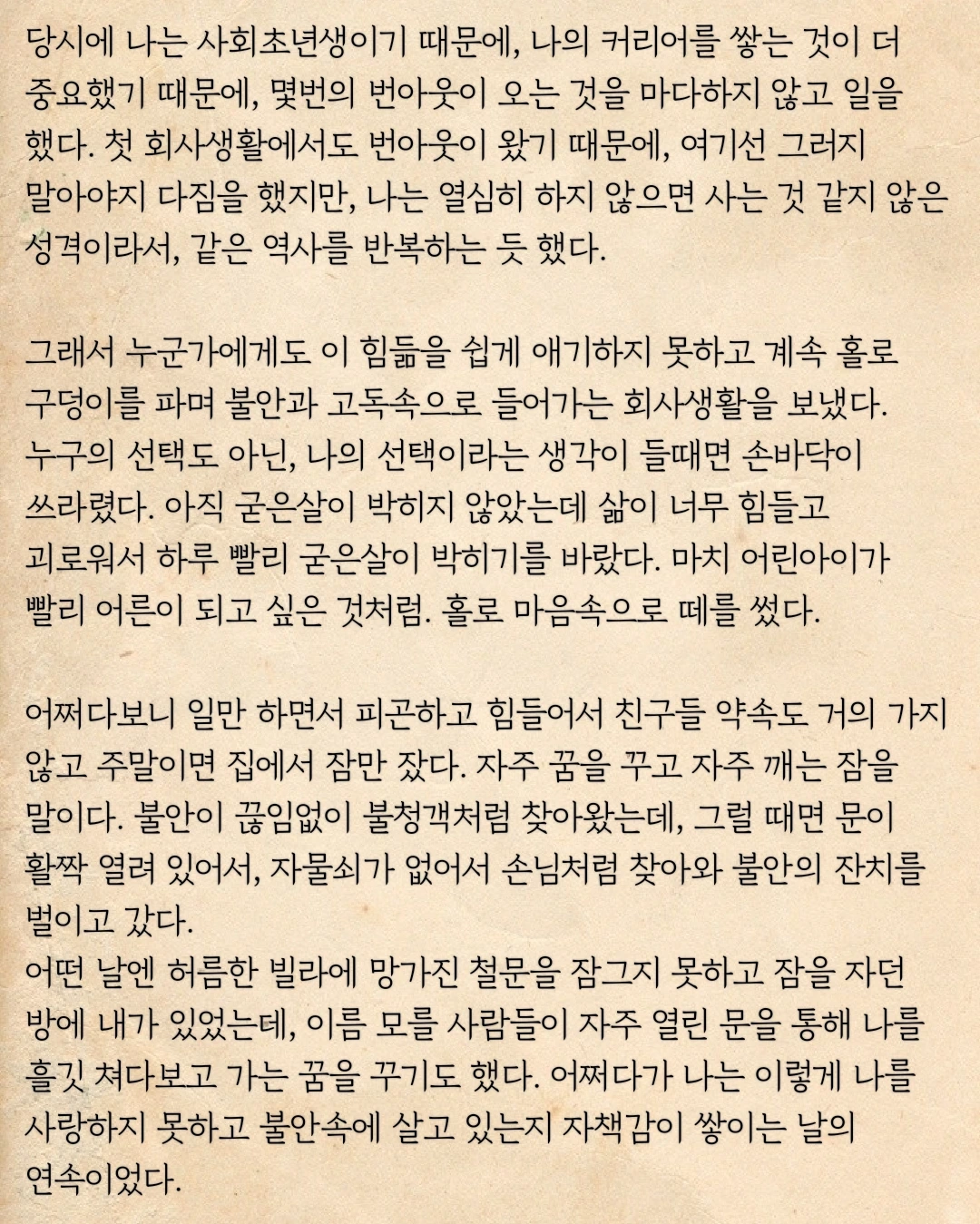 그래서 누군가에게도 이 힘듦을 쉽게 애기하지 못하고 계속 홀로 구덩이를 파며 불안과 고독속으로 들어가는 회사생활을 보냈다. 누구의 선택도 아닌, 나의 선택이라는 생각이 들때면 손바닥이 쓰라렸다. 아직 굳은살이 박히지 않았는데 삶이 너무 힘들고 괴로워서 하루 빨리 굳은살이 박히기를 바랐다. 마치 어린아이가 빨리 어른이 되고 싶은 것처럼. 홀로 마음속으로 떼를 썼다.