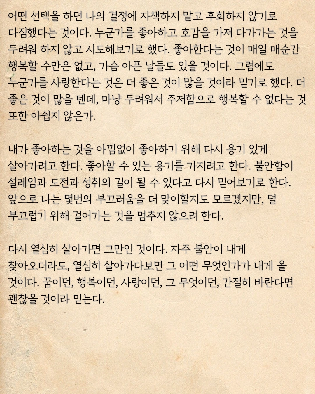 내가 좋아하는 것을 아낌없이 좋아하기 위해 다시 용기 있게 살아가려고 한다. 좋아할 수 있는 용기를 가지려고 한다. 불안함이 설레임과 도전과 성취의 길이 될 수 있다고 다시 믿어보기로 한다. 앞으로 나는 몇번의 부끄러움을 더 맞이할지도 모르겠지만, 덜 부끄럽기 위해 걸어가는 것을 멈추지 않으려 한다.