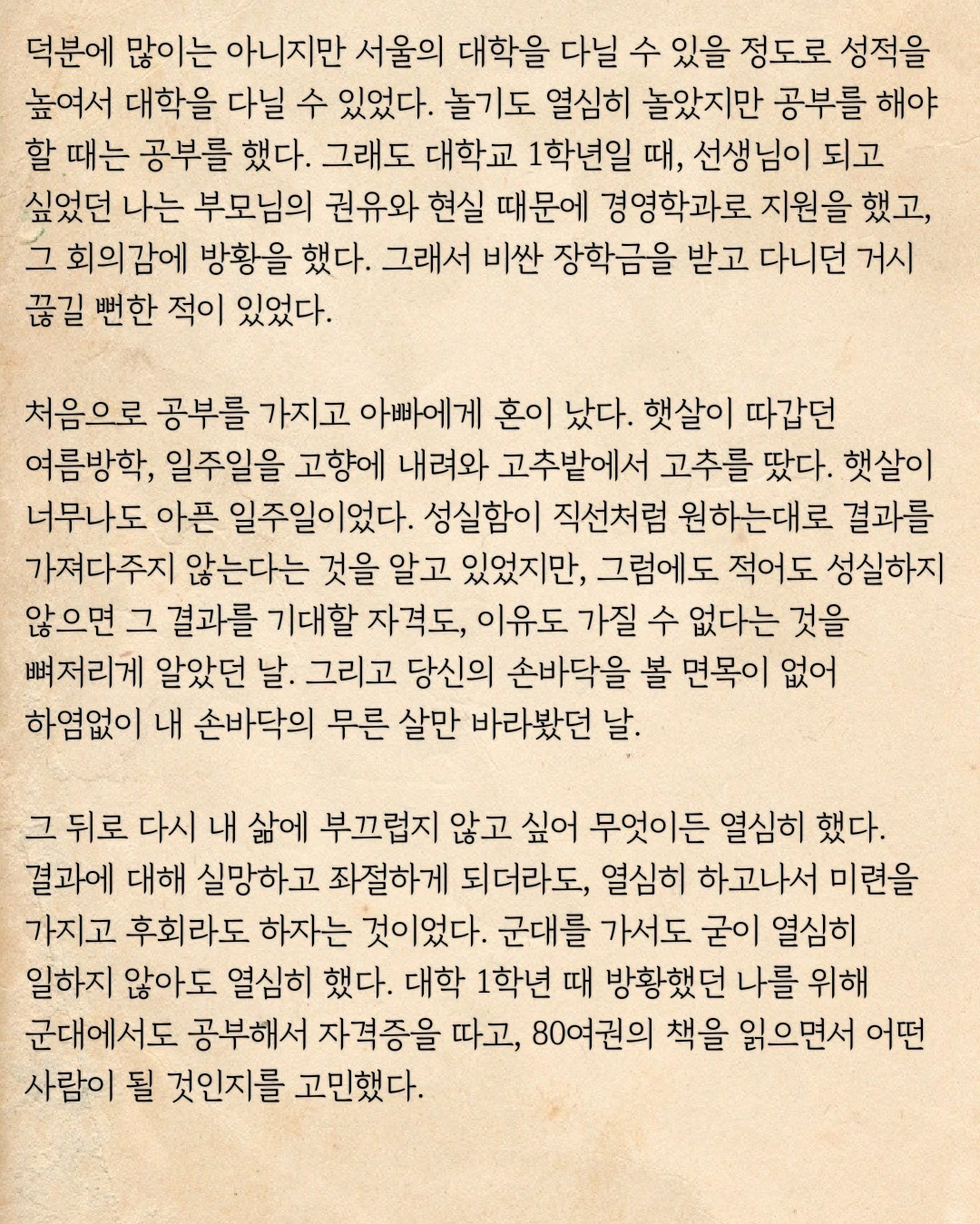 그 뒤로 다시 내 삶에 부끄럽지 않고 싶어 무엇이든 열심히 했다. 결과에 대해 실망하고 좌절하게 되더라도, 열심히 하고나서 미련을 가지고 후회라도 하자는 것이었다. 군대를 가서도 굳이 열심히 일하지 않아도 열심히 했다. 대학 1학년 때 방황했던 나를 위해 군대에서도 공부해서 자격증을 따고, 80여권의 책을 읽으면서 어떤 사람이 될 것인지를 고민했다.