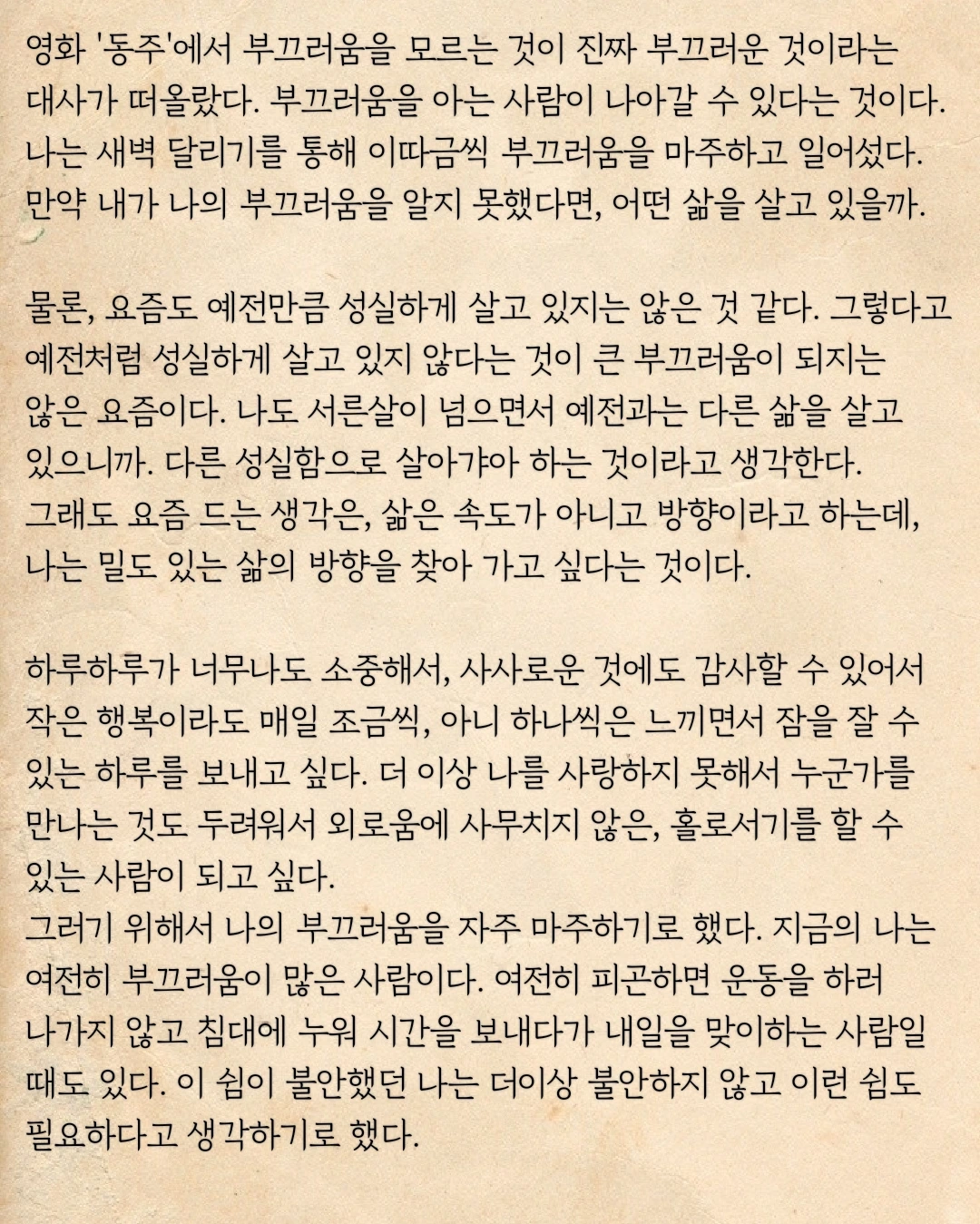 영화 '동주'에서 부끄러움을 모르는 것이 진짜 부끄러운 것이라는 대사가 떠올랐다. 부끄러움을 아는 사람이 나아갈 수 있다는 것이다. 나는 새벽 달리기를 통해 이따금씩 부끄러움을 마주하고 일어섰다. 만약 내가 나의 부끄러움을 알지 못했다면, 어떤 삶을 살고 있을까.