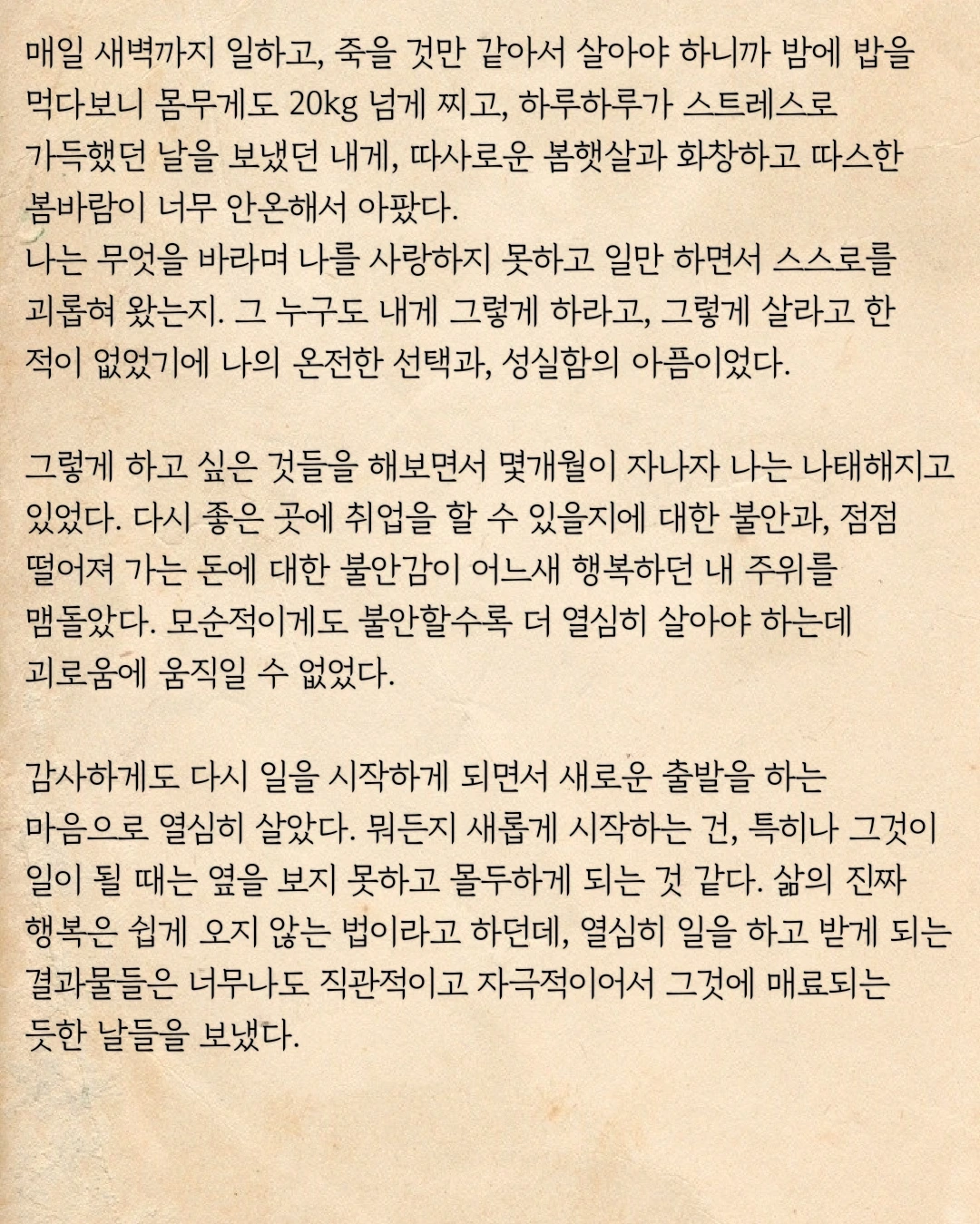 나는 무엇을 바라며 나를 사랑하지 못하고 일만 하면서 스스로를 괴롭혀 왔는지. 그 누구도 내게 그렇게 하라고, 그렇게 살라고 한 적이 없었기에 나의 온전한 선택과, 성실함의 아픔이었다.