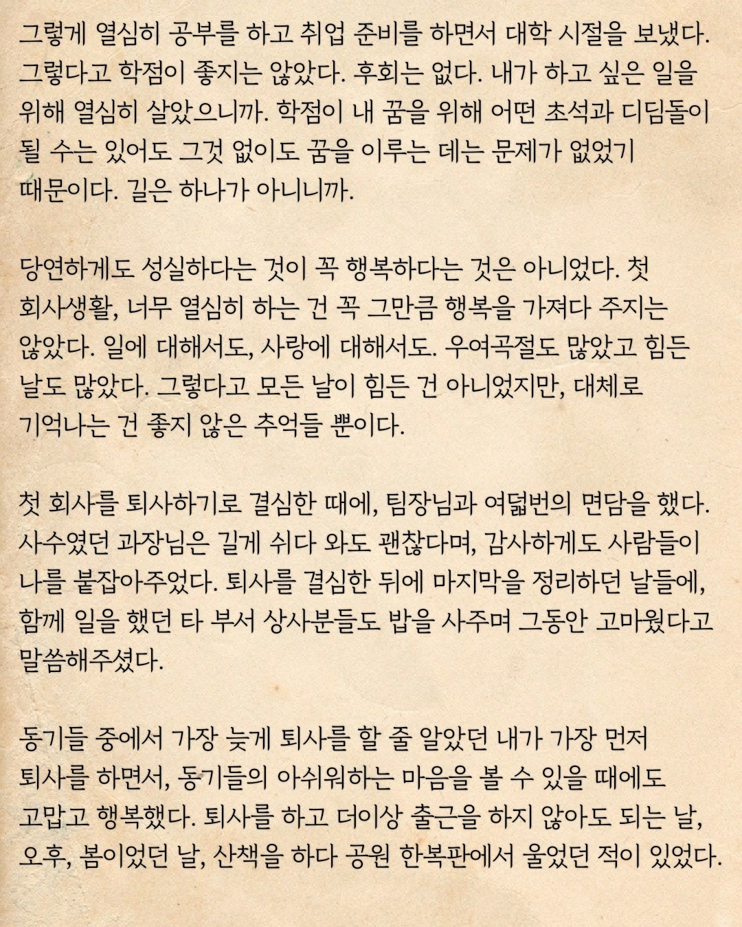 동기들 중에서 가장 늦게 퇴사를 할 줄 알았던 내가 가장 먼저 퇴사를 하면서, 동기들의 아쉬워하는 마음을 볼 수 있을 때에도 고맙고 행복했다. 퇴사를 하고 더이상 출근을 하지 않아도 되는 날, 오후, 봄이었던 날, 산책을 하다 공원 한복판에서 울었던 적이 있었다.