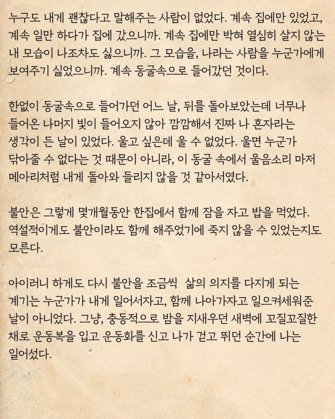 불안은 그렇게 몇개월동안 한집에서 함께 잠을 자고 밥을 먹었다. 역설적이게도 불안이라도 함께 해주었기에 죽지 않을 수 있었는지도 모른다. 아이러니 하게도 다시 불안을 조금씩 이겨내고 삶의 의지를 다지게 되는 계기는 누군가가 내게 일어서자고, 함께 나아가자고 일으켜세워준 날이 아니었다. 그냥, 충동적으로 밤을 지새우던 새벽에 꼬질꼬질한 채로 운동복을 입고 운동화를 신고 나가 걷고 뛰던 순간에 나는 일어섰다.