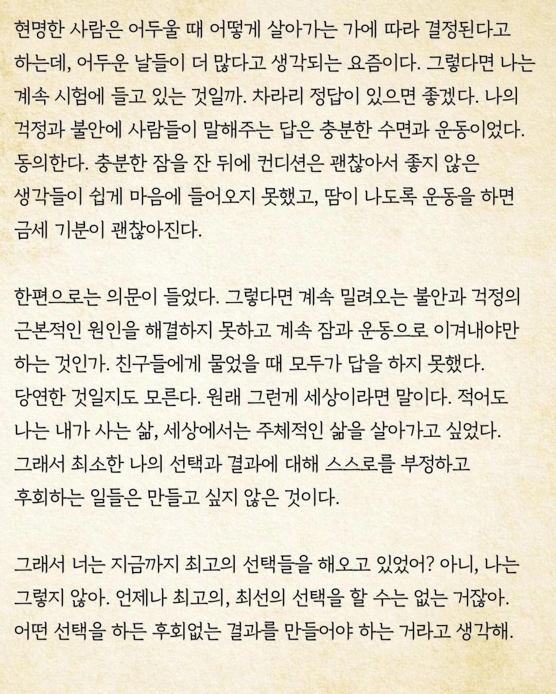 한편으로는 의문이 들었다. 그렇다면 계속 밀려오는 불안과 걱정의 근본적인 원인을 해결하지 못하고 계속 잠과 운동으로 이겨내야만 하는 것인가. 친구들에게 물었을 때 모두가 답을 하지 못했다. 당연한 것일지도 모른다. 원래 그런게 세상이라면 말이다. 적어도 나는 내가 사는 삶, 세상에서는 주체적인 삶을 살아가고 싶었다. 그래서 최소한 나의 선택과 결과에 대해 스스로를 부정하고 후회하는 일들은 만들고 싶지 않은 것이다.