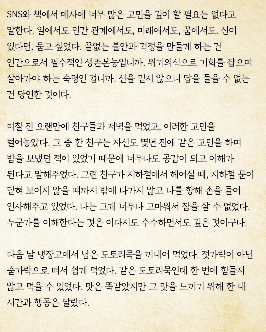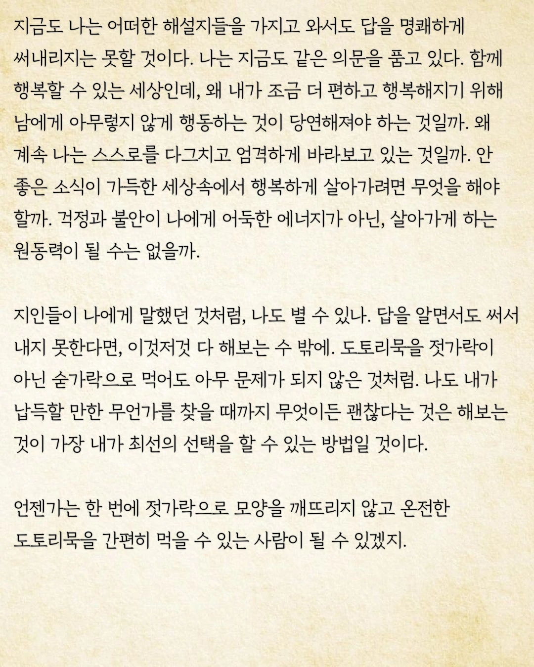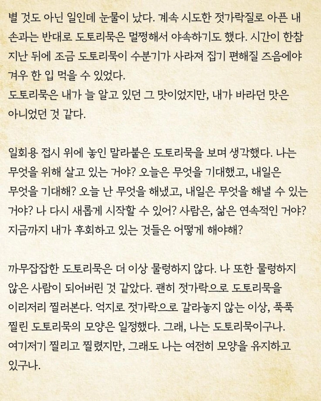 일회용 접시 위에 놓인 말라붙은 도토리묵을 보며 생각했다. 나는 무엇을 위해 살고 있는 거야? 오늘은 무엇을 기대했고, 내일은 무엇을 기대해? 오늘 난 무엇을 해냈고, 내일은 무엇을 해낼 수 있는 거야? 나 다시 새롭게 시작할 수 있어? 사람은, 삶은 연속적인 거야? 지금까지 내가 후회하고 있는 것들은 어떻게 해야해?