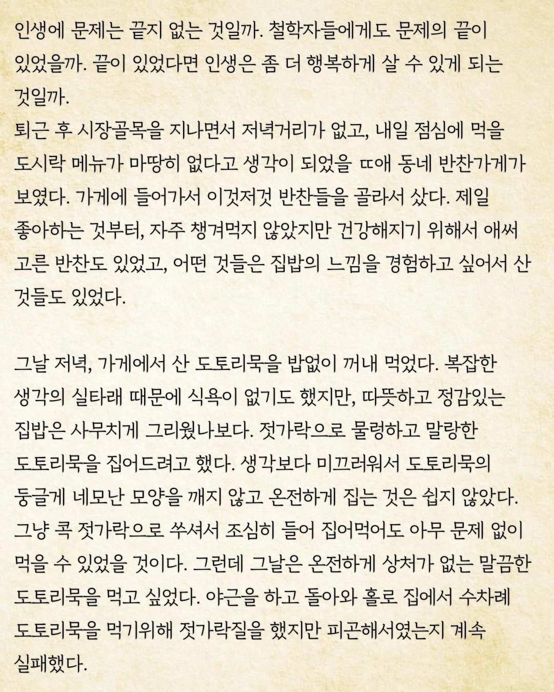 그날 저녁, 가게에서 산 도토리묵을 밥없이 꺼내 먹었다. 복잡한 생각의 실타래 때문에 식욕이 없기도 했지만, 따뜻하고 정감있는 집밥은 사무치게 그리웠나보다. 젓가락으로 물렁하고 말랑한 도토리묵을 집어드려고 했다. 생각보다 미끄러워서 도토리묵의 둥글게 네모난 모양을 깨지 않고 온전하게 집는 것은 쉽지 않았다.