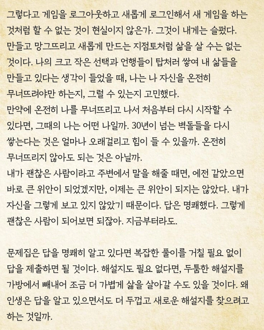 그렇다고 게임을 로그아웃하고 새롭게 로그인해서 새 게임을 하는 것처럼 할 수 없는 것이 현실이지 않은가. 그것이 내게는 슬펐다. 만들고 망그뜨리고 새롭게 만드는 지점토처럼 삶을 살 수는 없는 것이다. 나의 크고 작은 선택과 언행들이 탑처러 쌓여 내 삶들을 만들고 있다는 생각이 들었을 때, 나는 나 자신을 온전히 무너뜨려야만 하는지, 그럴 수 있는지 고민했다.