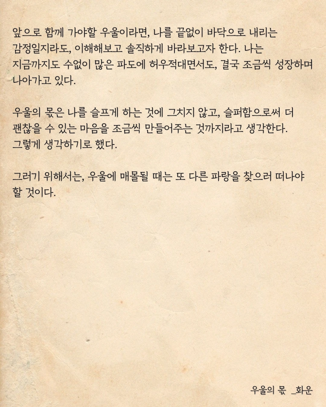 앞으로 함께 가야할 우울이라면, 나를 끝없이 바닥으로 내리는 감정일지라도, 이해해보고 솔직하게 바라보고자 한다. 나는 지금까지도 수없이 많은 파도에 허우적대면서도, 결국 조금씩 성장하며 나아가고 있다.