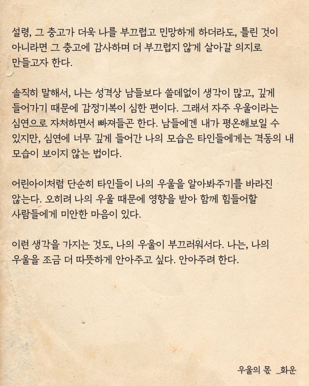 이런 생각을 가지는 것도, 나의 우울이 부끄러워서다. 나는, 나의 우울을 조금 더 따뜻하게 안아주고 싶다. 안아주려 한다.