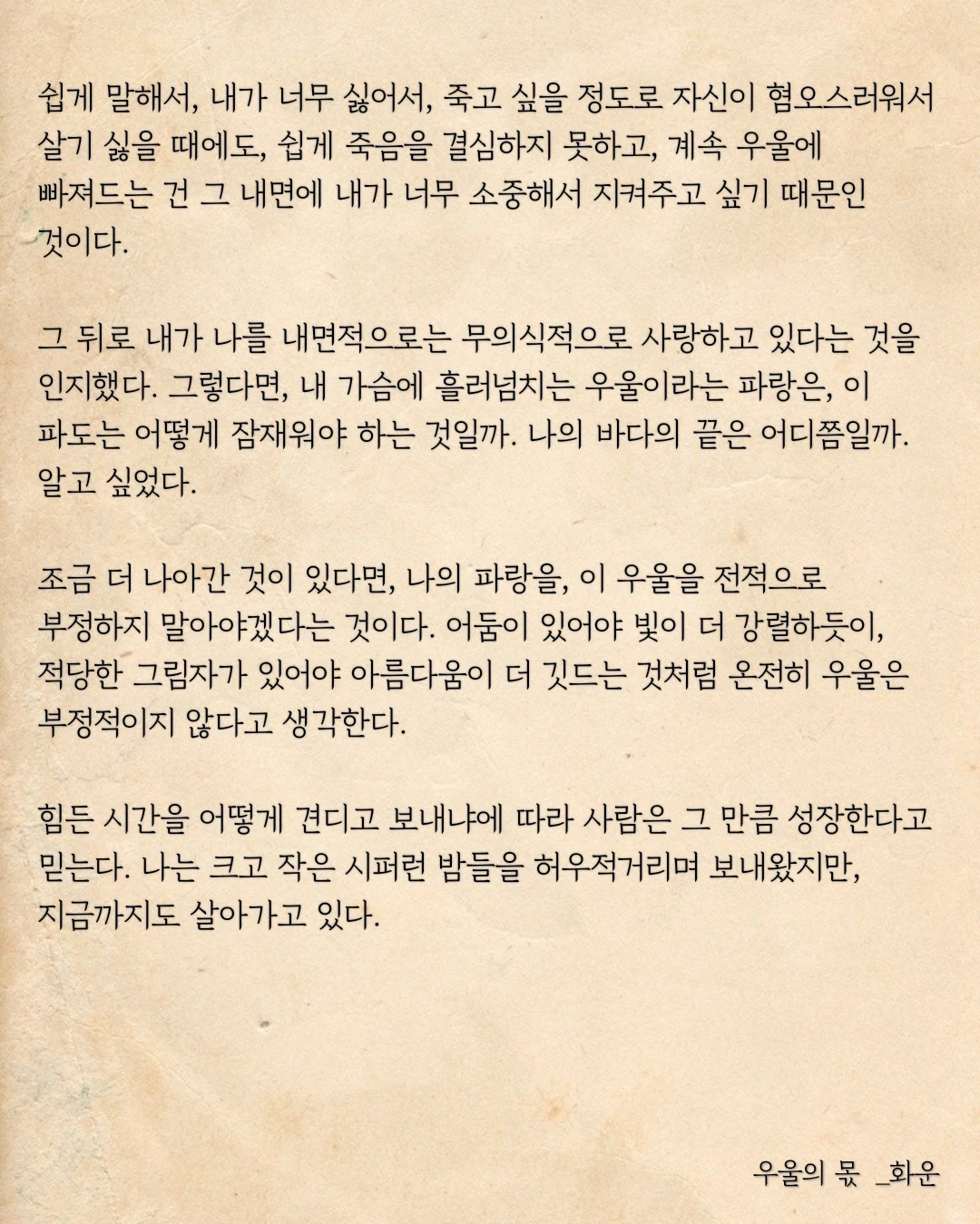 오히려 그 우울의 시간들을 보내는 만큼, 나는 조금 더 자라고 있다. 그런 의미에서 우울은 나에게, 나를 위한 몫을 해내고 있는 것이다.