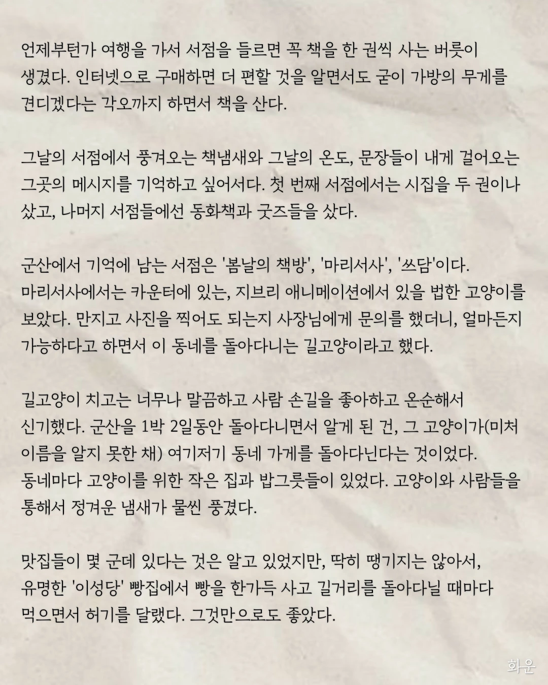 군산에서 기억에 남는 서점은 '봄날의 책방', '마리서사', '쓰담'이다. 마리서사에서는 카운터에 있는, 지브리 애니메이션에서 있을 법한 고양이를 보았다. 만지고 사진을 찍어도 되는지 사장님에게 문의를 했더니, 얼마든지 가능하다고 하면서 이 동네를 돌아다니는 길고양이라고 했다.