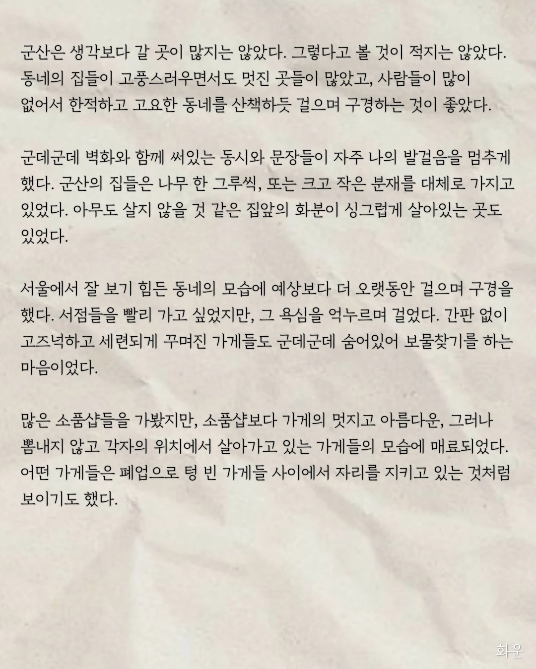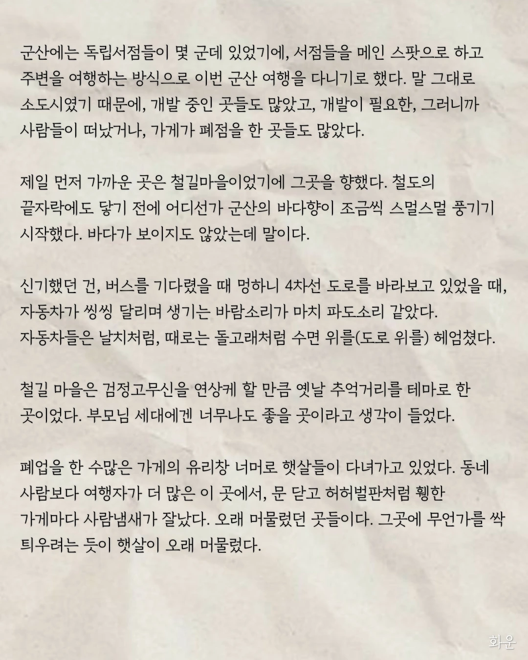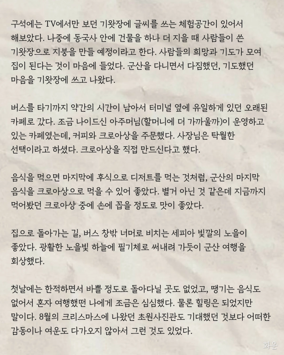 집으로 돌아가는 길, 버스 창밖 너머로 비치는 세피아 빛깔의 노을이 좋았다. 광활한 노을빛 하늘에 필기체로 써내려 가듯이 군산 여행을 회상했다.