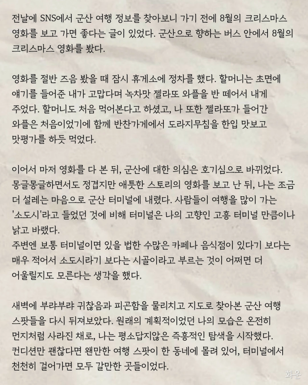 이어서 마저 영화를 다 본 뒤, 군산에 대한 의심은 호기심으로 바뀌었다. 몽글몽글하면서도 정겹지만 애틋한 스토리의 영화를 보고 난 뒤, 나는 조금 더 설레는 마음으로 군산 터미널에 내렸다. 사람들이 여행을 많이 가는 '소도시'라고 들었던 것에 비해 터미널은 나의 고향인 고흥 터미널 만큼이나 낡고 바랬다.