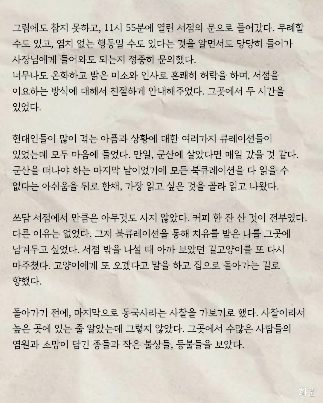 '봄날의 책방'은 독특하게도 신발을 벗고 들어가야만 하는 독림서점이었다. 그 안에는 흰 머리와 인자한 미소가 가득한 사장님이 있었는데, 나를 보자 차를 한 잔 건네며 몇 시간이던 상관없이 편하게 있다가 가도 좋다고 하셨다.