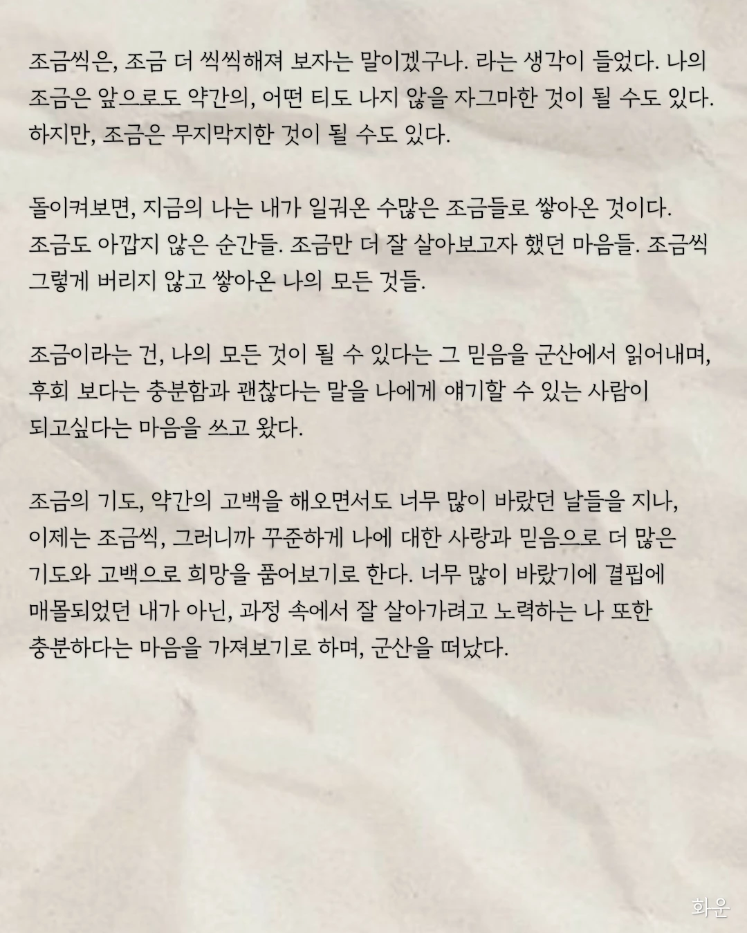 이제는 조금씩, 그러니까 꾸준하게 나에 대한 사랑과 믿음으로 더 많은 기도와 고백으로 희망을 품어보기로 한다. 너무 많이 바랐기에 결핍에 매몰되었던 내가 아닌, 과정 속에서 잘 살아가려고 노력하는 나 또한 충분하다는 마음을 가져보기로 하며, 군산을 떠났다.