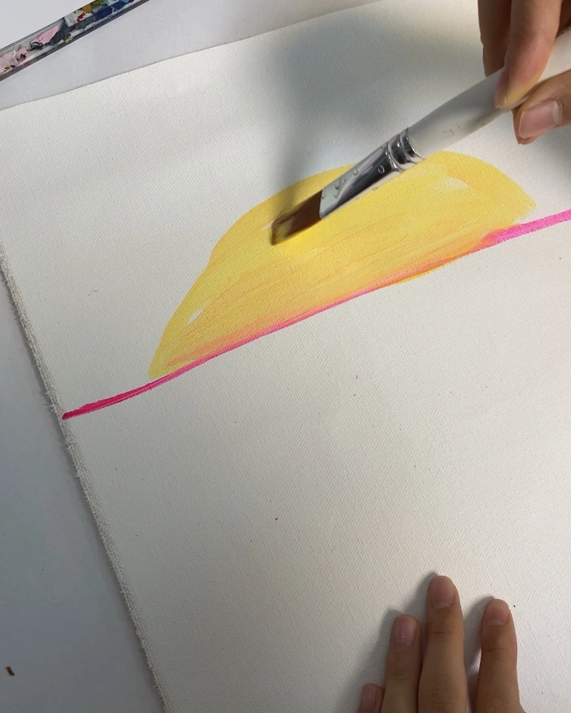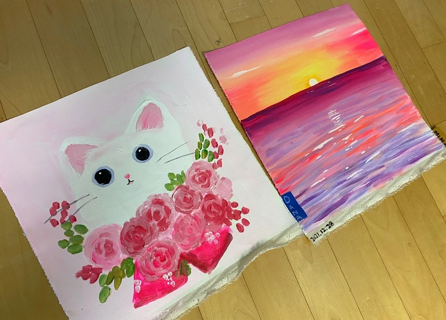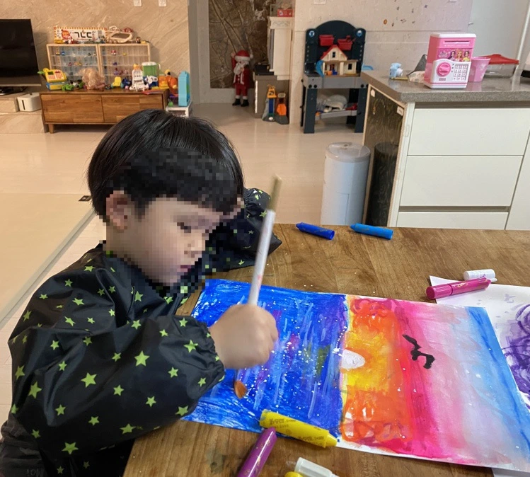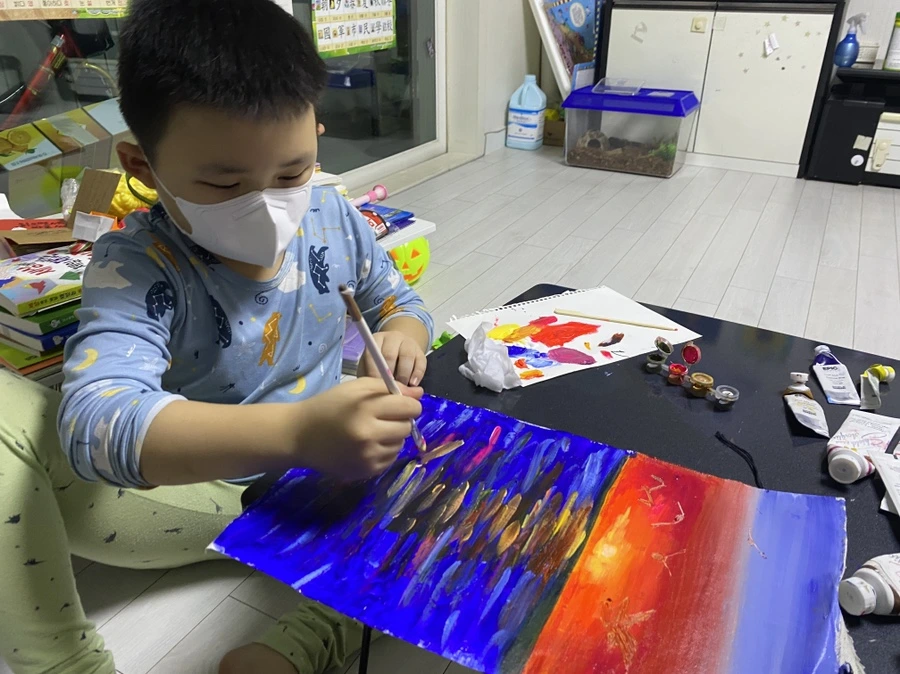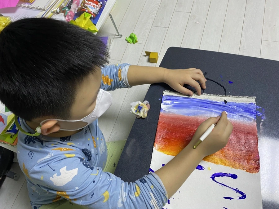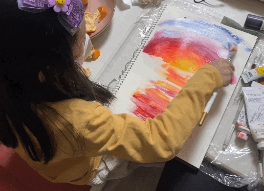 초등학교 1학년 아이에게는 조금 커 보이는 붓을 잡고 열심히 그러데이션을 하고 있다. 내가 무엇을 그리자고 해도 “어머, 선생님 너무 좋은 생각인데요?” 라며 손뼉 쳐주는 사랑스러운 아이다. 붓을 잡는 것이 아직 능숙하진 않지만 표현은 아주 척척 해낸다. 작품을 완성하고 나면 어김없이 오늘 그림이 제일 멋지다며 행복해한다. 핫핑크와 노랑을 섞어 만든 해 주변 색깔이 포인트.