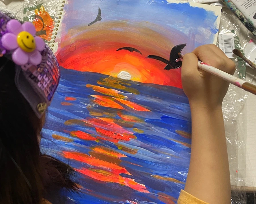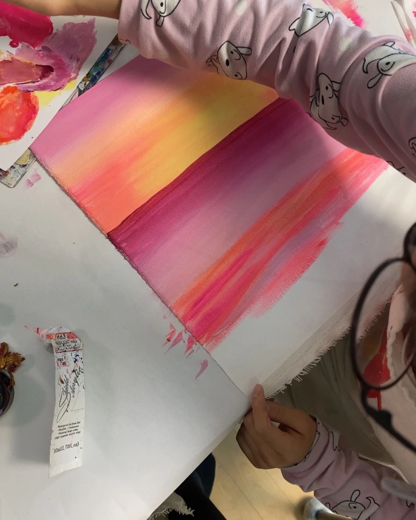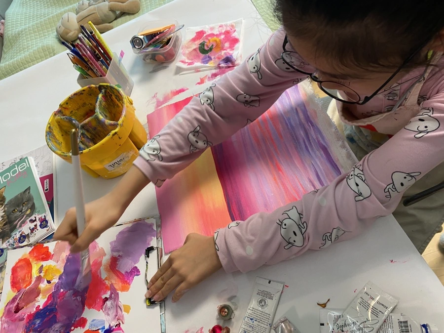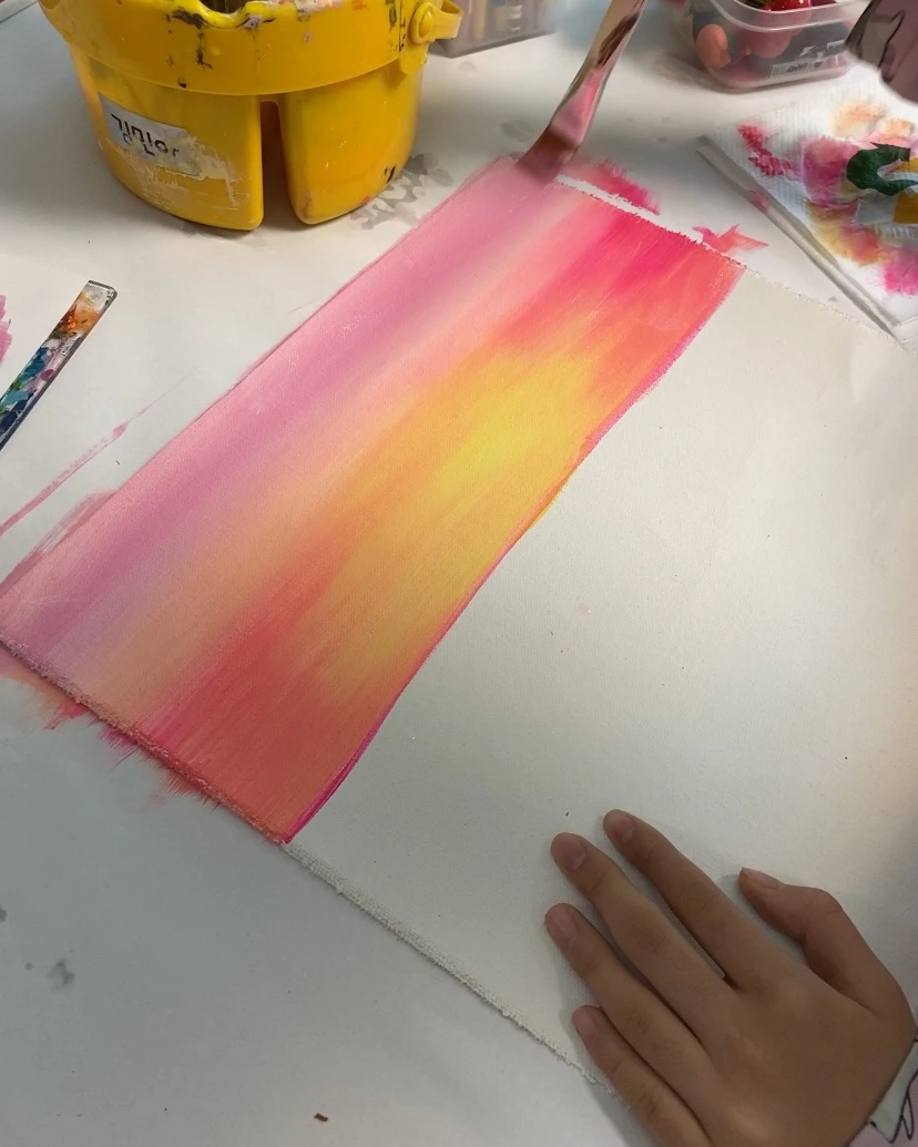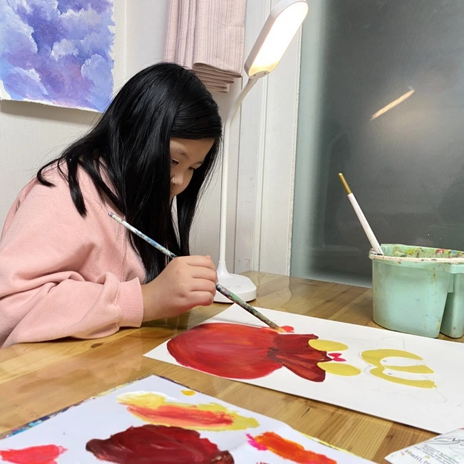 초등학교 1학년 아이에게는 조금 커 보이는 붓을 잡고 열심히 그러데이션을 하고 있다. 내가 무엇을 그리자고 해도 “어머, 선생님 너무 좋은 생각인데요?” 라며 손뼉 쳐주는 사랑스러운 아이다. 붓을 잡는 것이 아직 능숙하진 않지만 표현은 아주 척척 해낸다. 작품을 완성하고 나면 어김없이 오늘 그림이 제일 멋지다며 행복해한다. 핫핑크와 노랑을 섞어 만든 해 주변 색깔이 포인트.