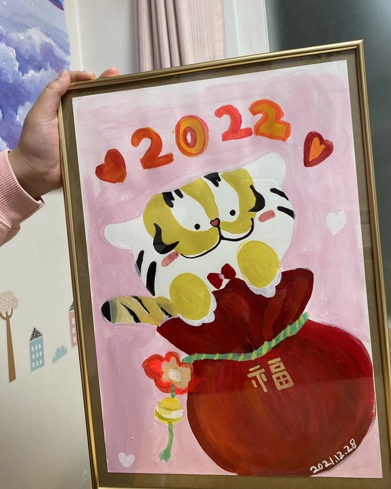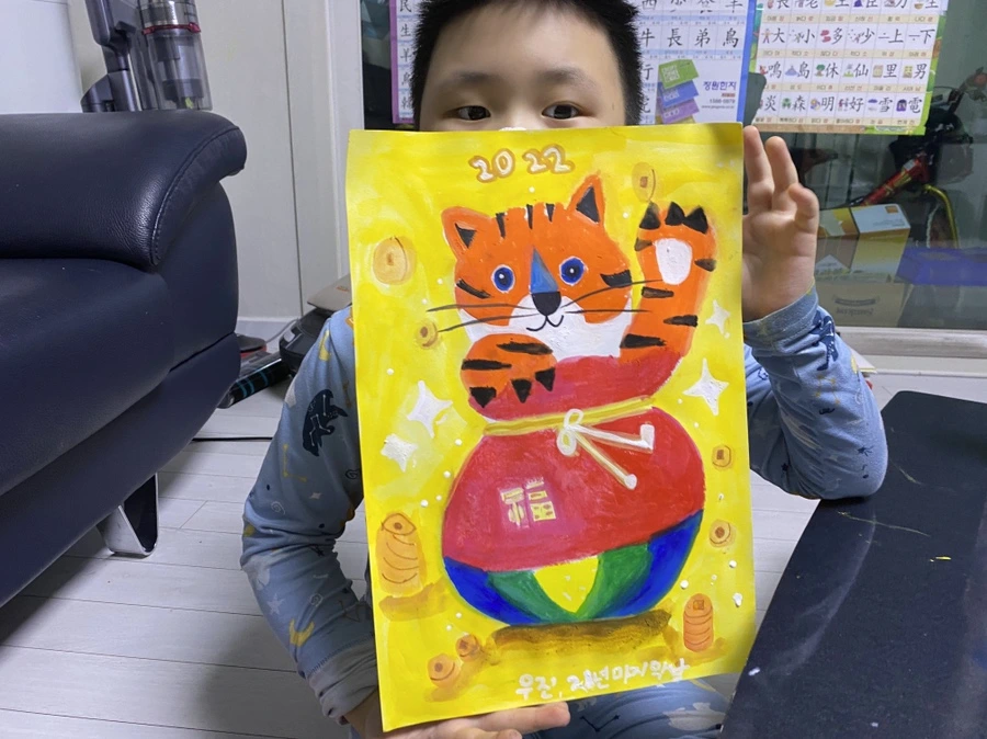 호랑이와 복주머니를 합쳐서 만든 이미지들. 각자의 표현 법대로 완성한 그림을 보면 신기하고, 대단하다.