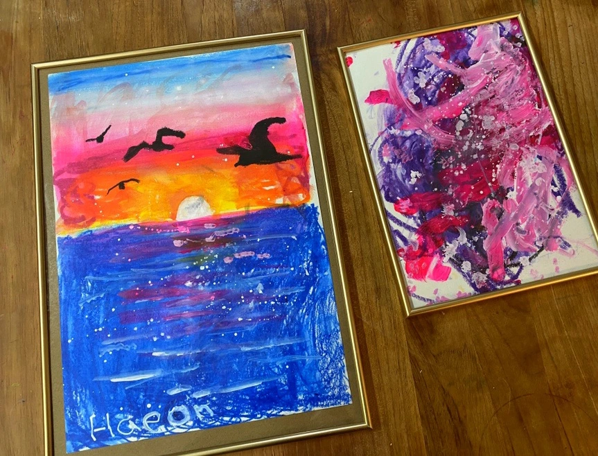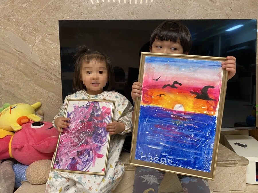 동생은 오빠가 손에 쥔 새로운 것은 지금 당장 쓰고 싶어 하기 때문에 오빠는 새로운 걸 손에 쥐자마자 항상 서둘러 동생에게 내어준다. 오빠는 표현하고 싶은 게 많은데 자꾸만 빼앗기고, 동생은 자기도 써보고 싶은데 오빠가 좋은 건 먼저 알아보고 차지하니 답답하다. 역시 예술가의 길은 순탄치 않다. 동생도 오빠도 억울함은 매한가지이기에 요새는 재료를 두 개씩 챙겨가는 편이다. 3살의 나이차는 크지 않지만 6살 오빠는 언제나 형태를 멋지게 그려내고, 3살 동생은 아직 색깔, 선, 점으로만 표현한다는 점에서 발달면으로 꽤 차이가 나보인다. 하지만 동생도 항상 그리고자 하는 것이 있다는 점에서 언제나 제목이 있는 엄연한 Abstract Painting이다.