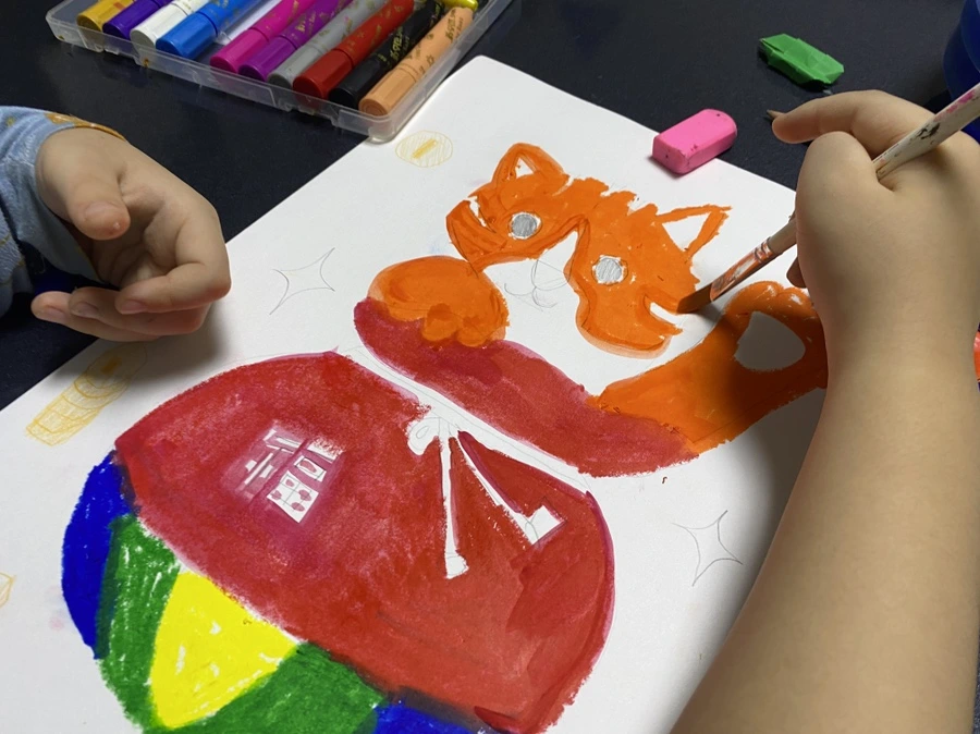 확실히 견고한 표현을 할 수 있는 고학년들의 작품은 완성할 때마다 감탄이 나온다. 나와의 수업이 일 년이 넘은 이 아이들은 물감과 붓을 꾸준히 써서 이젠 제법 잘 다룬다. 붓이 손에 익으려면 시간이 오래 걸리는데 이렇게 금방 얇은 선을 잘 쓰는 아이들을 보면서 역시 아이들의 습득력은 참 빠르구나 감탄한다. 새로운 재료를 가져가면 금세 익히니 나도 망설임 없이 다양한 재료로 수업을 하는 편인데 파스텔, 아크릴 물감, 잉크 등 학교에서 잘 안 해봤음직한 재료들로 그림을 그리면 몰입도가 생긴다. 아이들이 “우와, 이건 뭐예요?” 라며 신기해하면, 새로운 경험을 선사한 것 같은 뿌듯함에 마치 내가 재료를 만들어낸 사람처럼 즐겁기도 하다. 내 눈엔 모두가 정말 예술가 같다. 그러데이션도 잘하고 형태력도 좋다고 자주 칭찬해주니 아이들이 이젠 자신감이 붙어서 주제를 던져주면 도전정신을 가지고 충분히 마음에 드는 그림을 그리려고 열정을 낸다. 역시 고학년은 다르다. 하지만 이 아이들도 집에서는 내복을 입고 있다. 물감이 여기저기 묻기 때문에 작업복 삼아 입는 것 같지만 그 모습이 영락없는 아이들 같아 참 귀엽다.