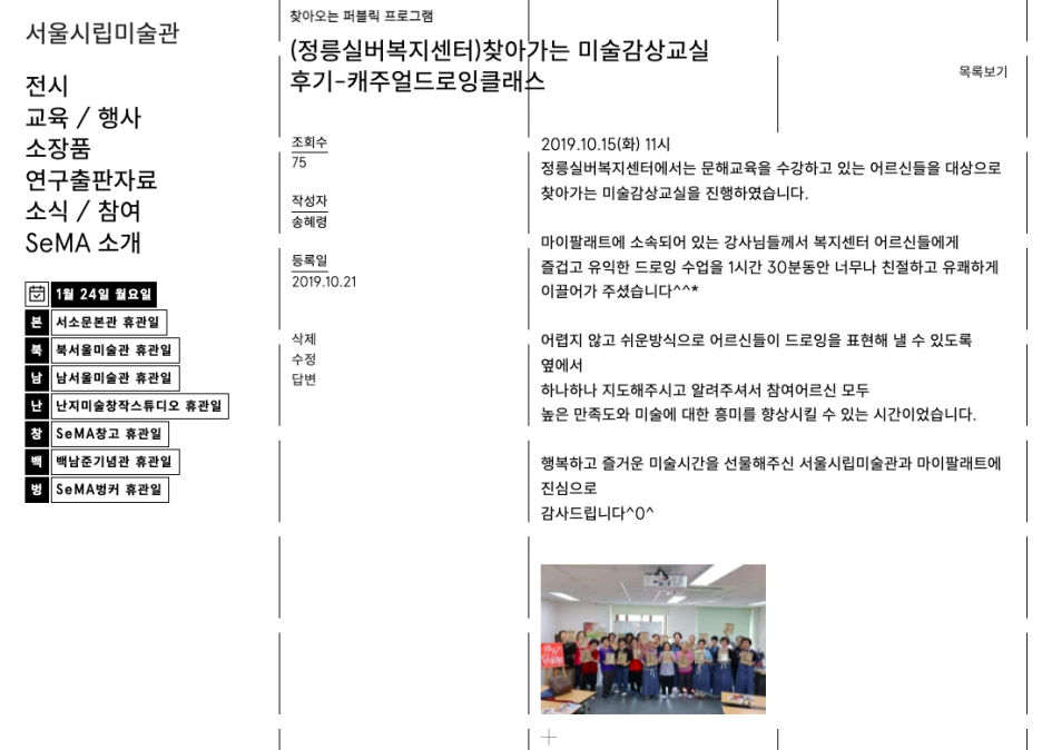 서울시립미술관 '찾아가는 미술 감상교실'에 우리 프로그램을 제안해서 처음 매칭 된 '서울 정릉 실버타운'에서의 수업. 마침 수업장소였던 정릉은 학교생활에 기억이 있는 곳이라 무척 반가웠다. 기본적으로 감상에 빠지기 쉬운 조건인 <할머니>, <자주 가던 동네>의 키워드라니, 오늘 수업은 그 어느 때보다 잘하고 싶은 의지가 마구 솟구쳤다.