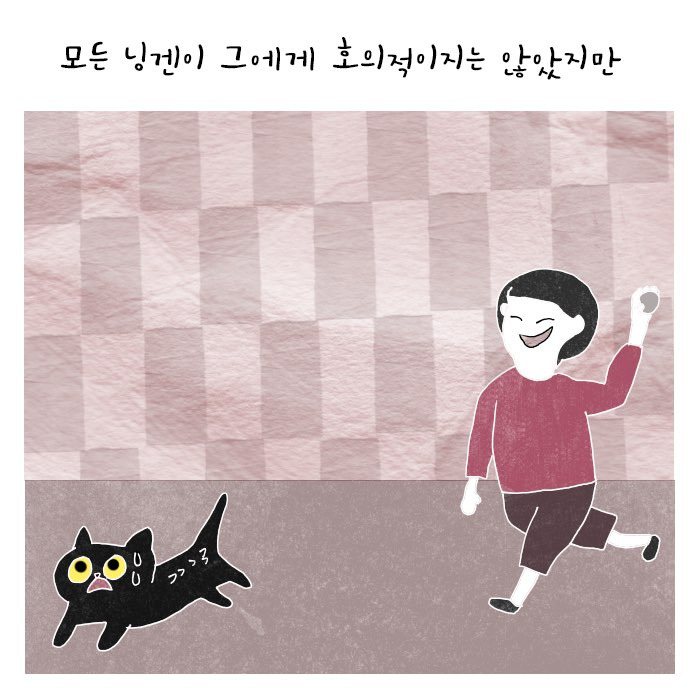 힘들어하는 깜냥이와 즐거워하는 아이의 대조적인 모습을 보고 독자분들이 각자의 느낌을 가지면 된다고 생각했습니다.