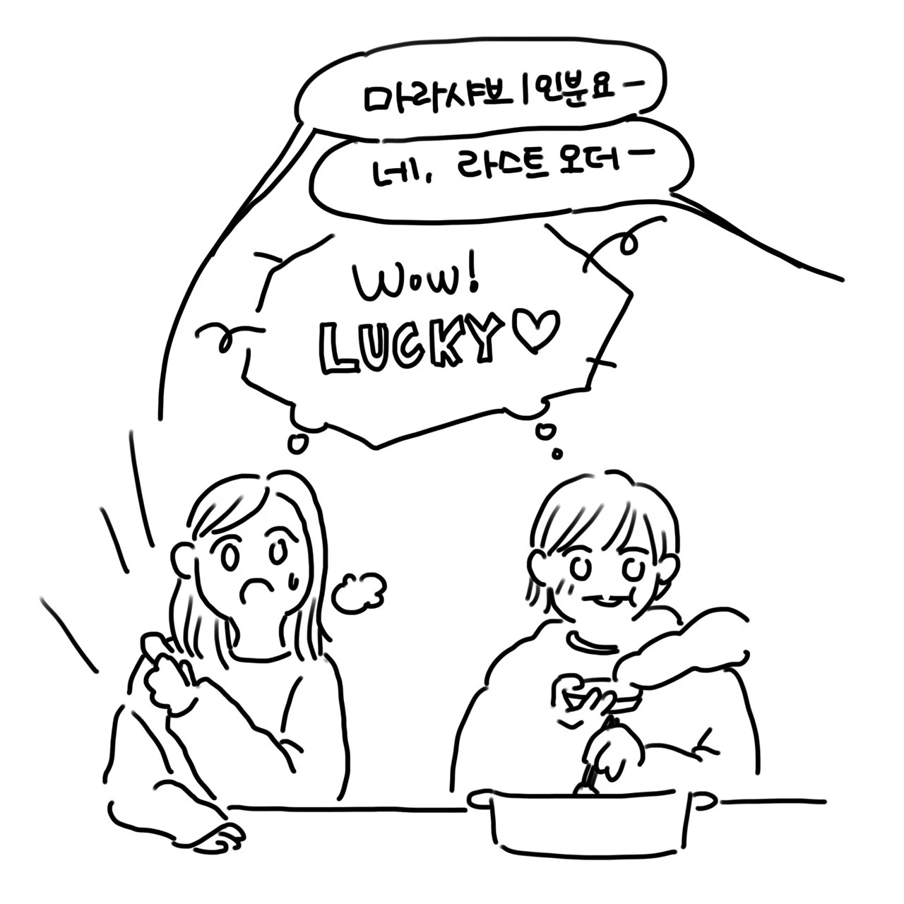 한참 맛있게 먹고 있을 때 옆 자리에 사람이 앉았다. '마라맛 샤브샤브요' 마지막 오더였다. 오오, 럭키. 간신히 세이브하셨군요. 저녁 식사를 굶지 않으셔도 되겠어요. 일면식도 없는 사람이지만 분명 속으로 세레머니를 하고 있을거라 생각했다. 그래서 나도 함께 속으로 세레머니 해주었다. 물론 그녀는 당신 옆에서 땀을 흘리며 샤브샤브를 먹고 있는 풍채 좋은 여자가 이런 생각을 하고 있는 줄은 꿈에도 모르시겠지만요.