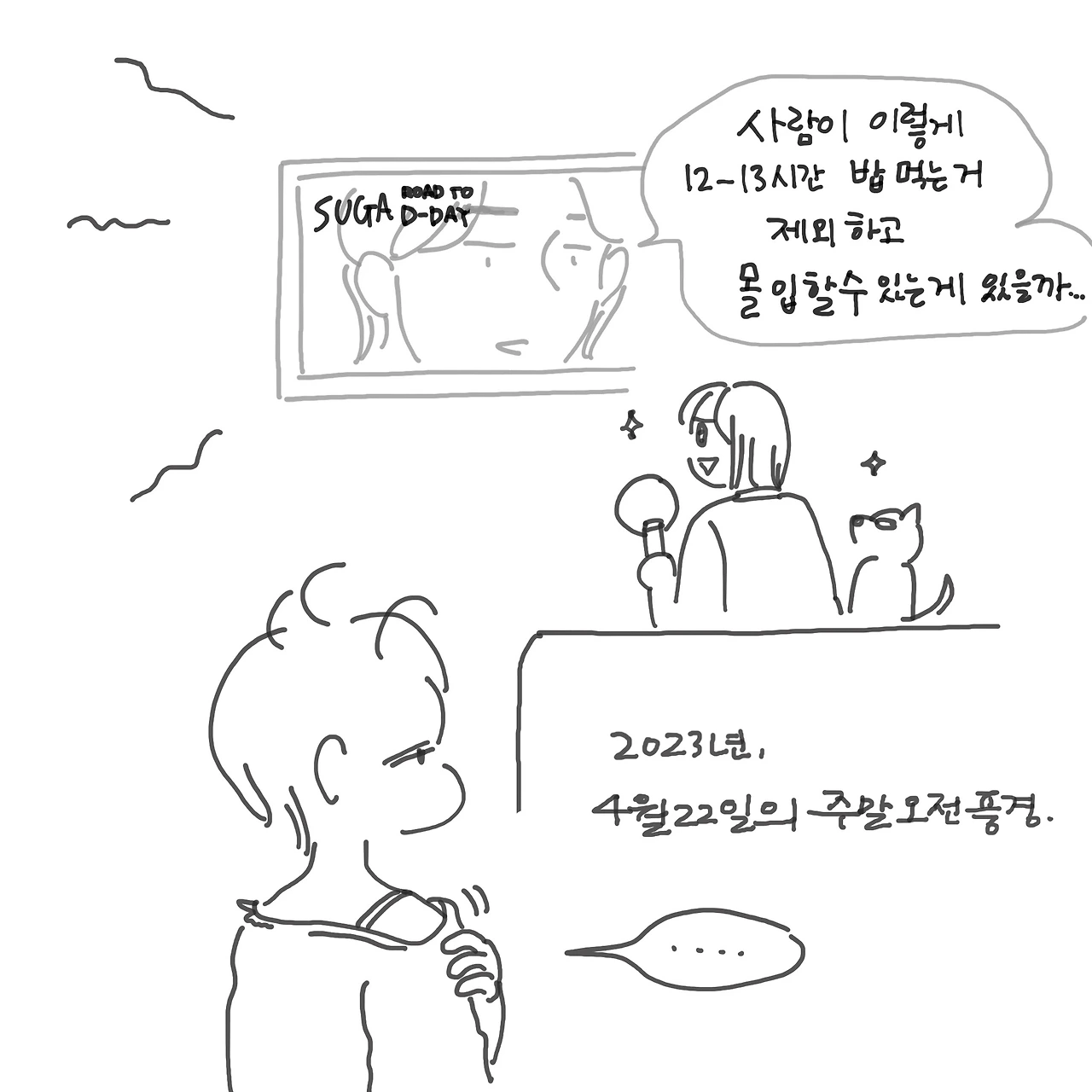 방탄소년단의 찐팬인 동거녀는 신실한 아미로서, 주말마다 방탄 노래를 찬송가처럼 틀어놓고 그들의 근황을 미사 보듯이 열심히 챙겨본다. 덕분에 나는 방탄소년단의 근황을 그 누구보다 빠르고 투머치하게 알 수밖에 없었다. 화면에는 윤기가 나오고 있었고, 그는 오랜 꿈이었던 음악 여행을 떠나는 다큐를 찍었다는 이야기를 하고 있었다. 음악 여행이라니. 전 세계 여러 도시의 아티스트들과 교류하며 음악을 통해 새롭게 하고 싶은 이야기를 찾아가는 여정이라니. '말만 들어도 졸라 멋있네...' 속으로 생각하며 다 늘어난 티셔츠를 괜히 멋쩍게 고쳐 입었다. 초라한 나 자신이 갑자기 부끄러워진 것이다.