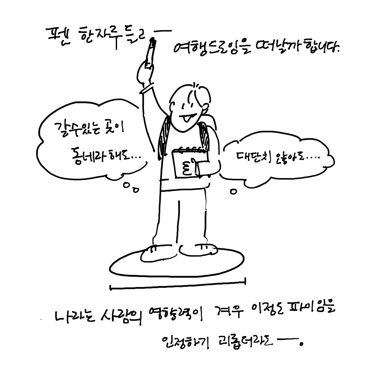 펜 한 자루 들고 스케치 여행을 떠나는 나를 떠올려본다. 아무 데나 발길 닿는 데로 걷고, 눈에 보이는 걸 그리고, 사람들과 교류한다. 내가 꿈꾸던 그 멋진 장면, 이제는 꿈만 꾸는 것이 아니라 실천할 때가 온 것 같다. 아티스트들을 만나러 음악 여행을 떠난 민윤기처럼 대단하고 멋진, 수많은 사람들을 감동시킬 그런 다큐는 찍을 수 없을지라도. 나는 내가 할 수 있는 만큼의 감동의 파이만큼은 그리며 살 수는 있지 않을까. 그게 단 몇 사람에게 가닿을 정도의 작은 파이일지라도.