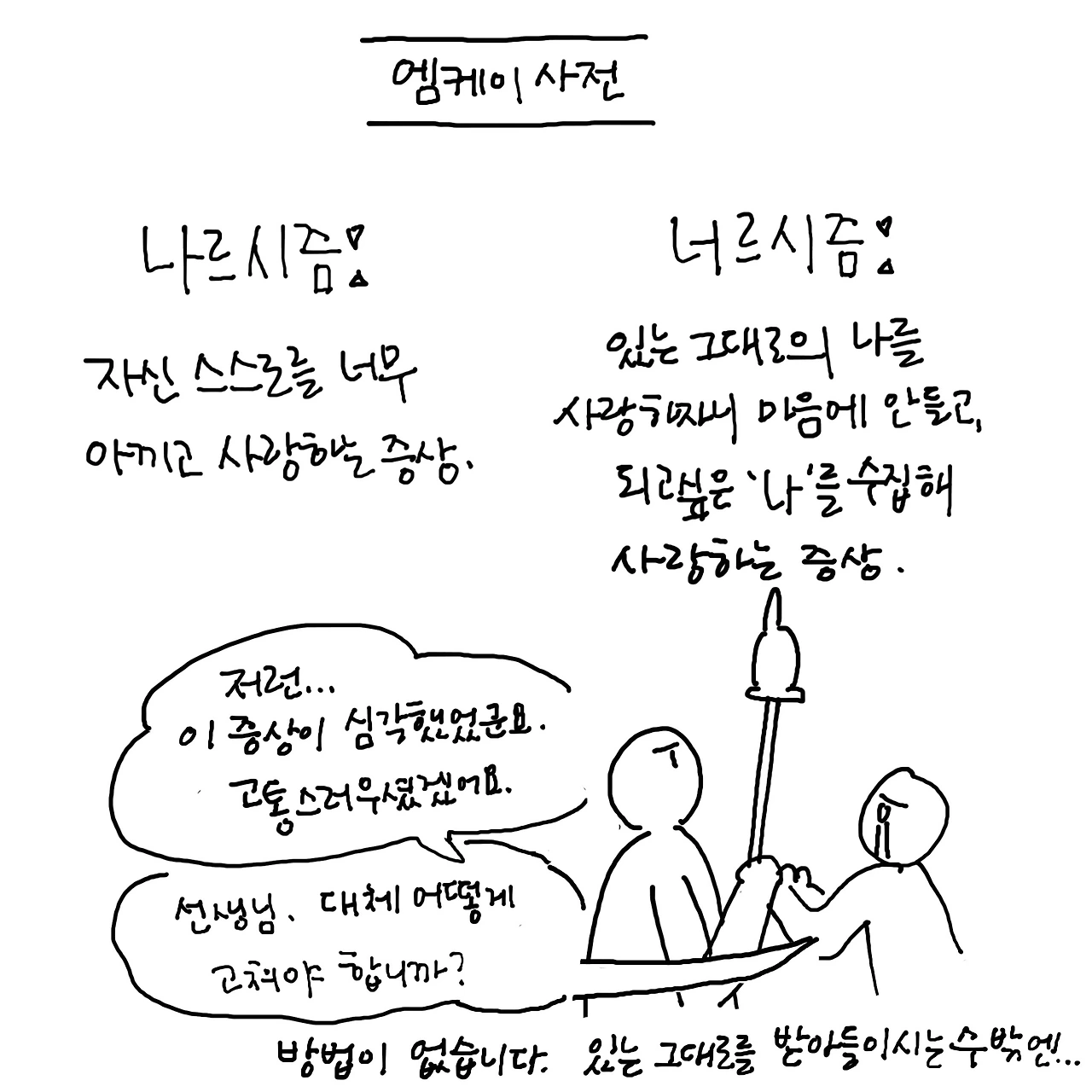 그 결과, 현실의 나는 구박데기 취급하고 되고 싶은 나는 신줏단지 모시듯 살아온 꼴이 됐다. 실존의 나를 외면하니 외로워지고, 허상의 나는 나를 더 외롭게 하기만 했으니. 아, 어리석고 슬픈 너르시즘이여...