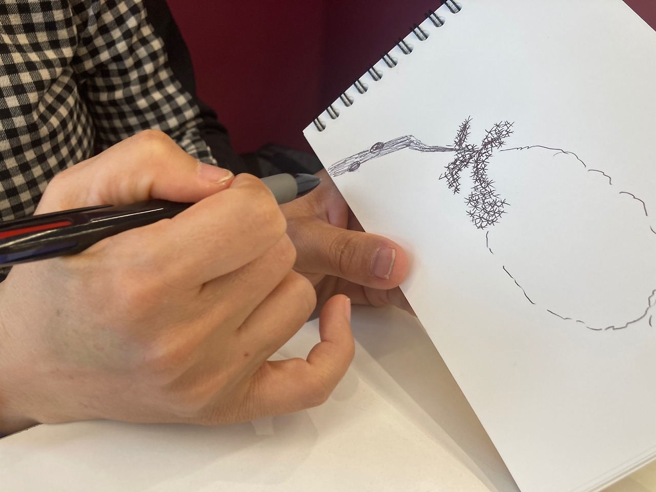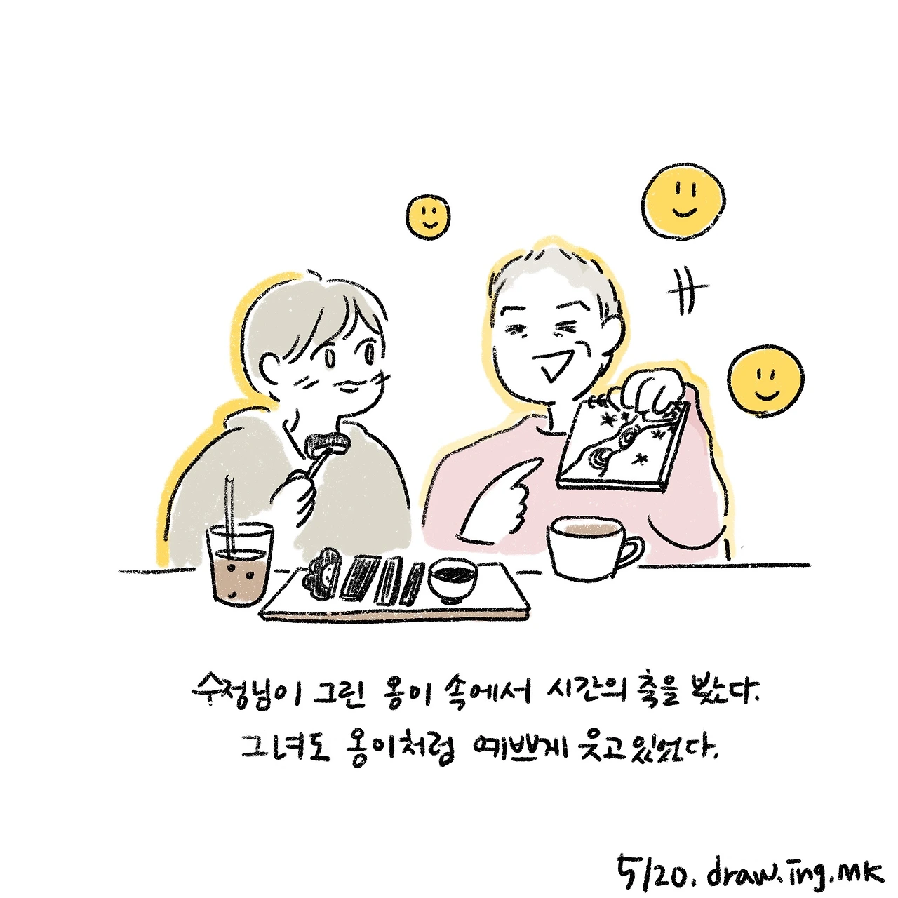 수정님은 이름 그대로 투명하고 단단한 존재였다. 암투병 중인 그녀는 자신의 고통도 감당하기 어려울 텐데 나의 우울과 안위를 걱정했다. 그리고 맑게 웃으며 처음 가보는 동네의 제과점에서 약과라테와 과자를 사주었다. 우리는 나란히 앉아 이런저런 이야기를 나누었다. 그리고 최근에 수정님이 그린 그림을 보여줬다.