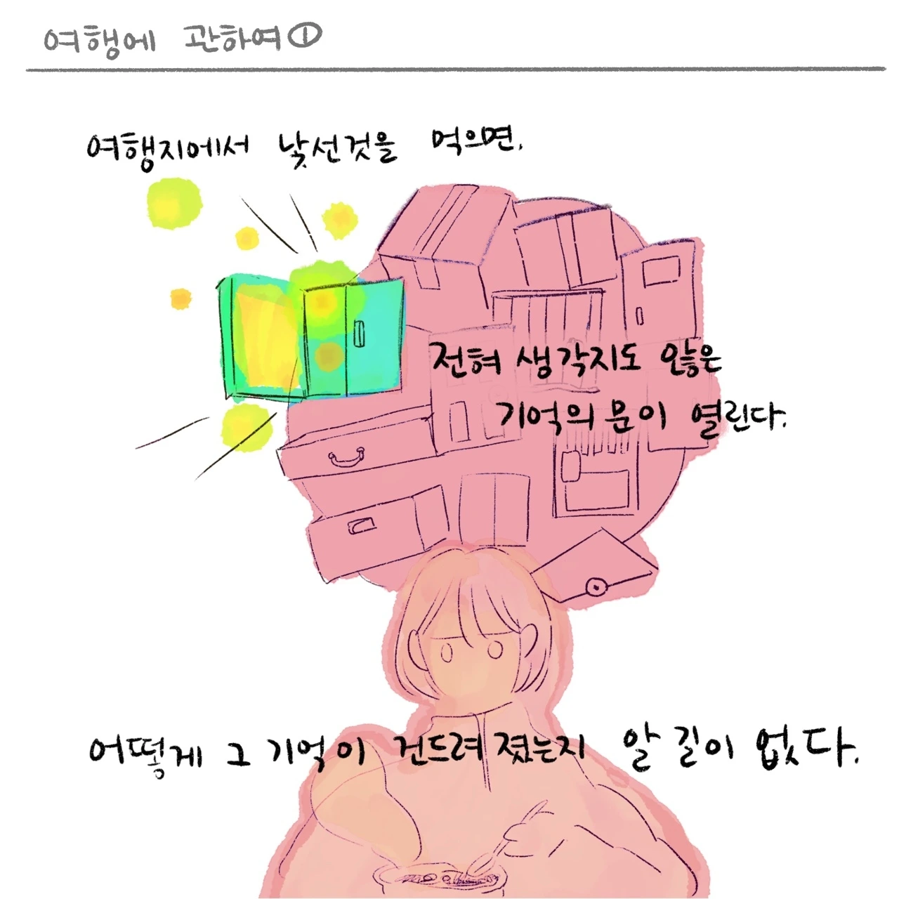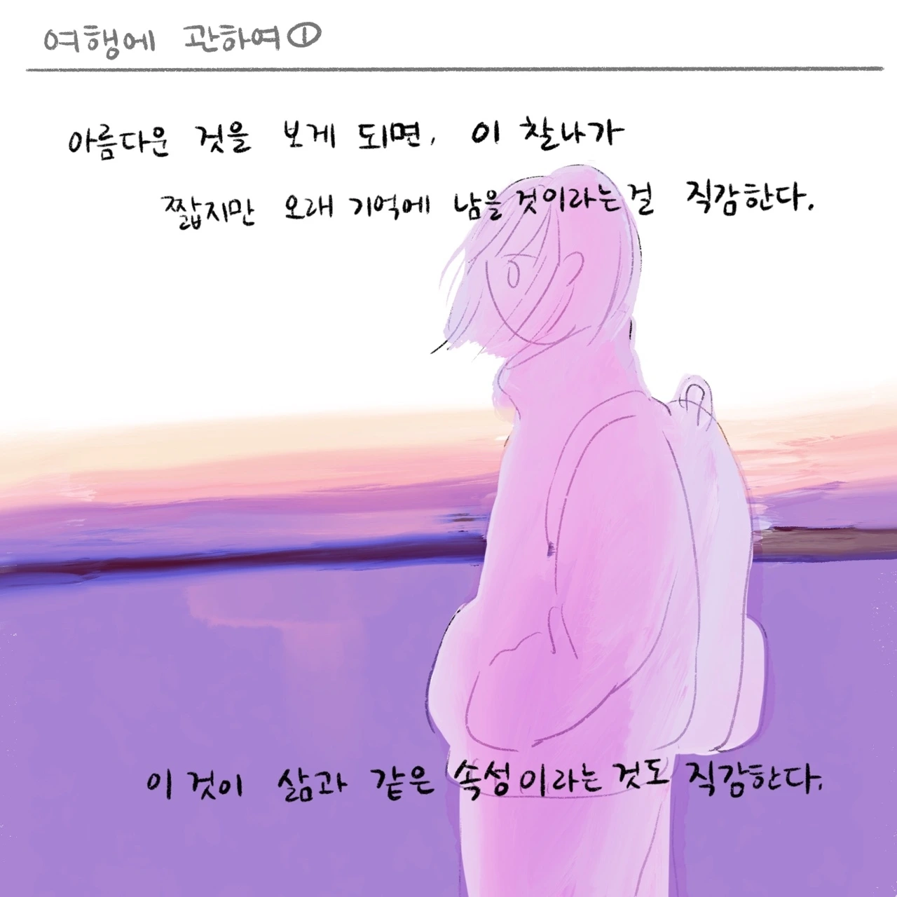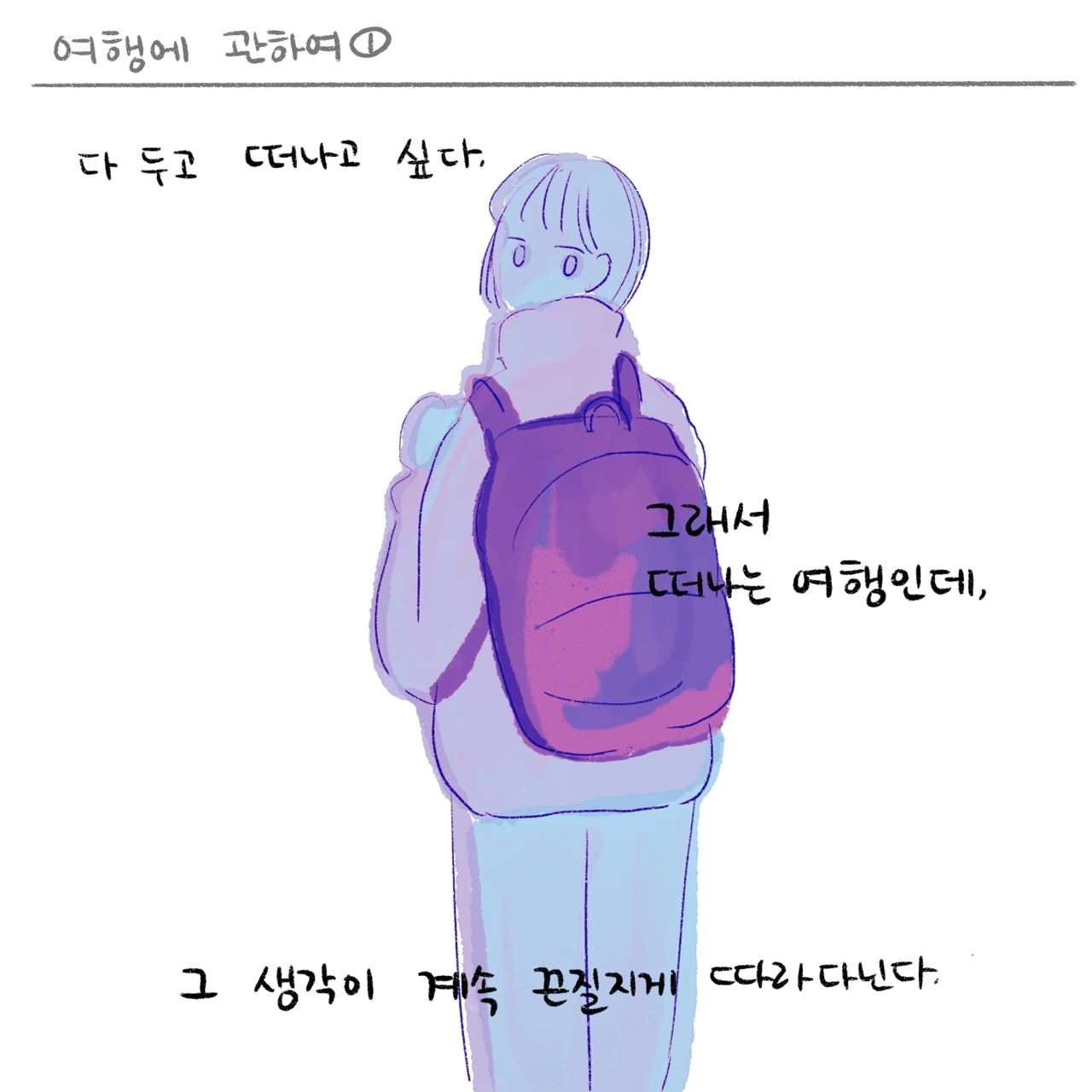마감근육을 하면서 처음 한 달은 매일 매일 최대치의 힘을 써서 글과 그림을 꽉꽉 채웠는데, 이번 한 달은 '잠깐의 힘으로 어디까지 표현 할 수 있을까?' 에 집중하고 있는 것 같아요. 어차피 저는 매일 죽을 힘을 다해서 살 만큼 단단하지 않다는 걸 잘 압니다. 내가 할 수 있는 제일 좋은 것은 매일 매일 나오지 않는다는 것도요. 그걸 알면서도 그린다는 건 정말 힘든 일 같습니다. 여행도 그런 맥락에서 비슷한 것 같아요. 다시 일상으로 돌아올 걸 알면서도 떠나는 그 심정 말이지요.