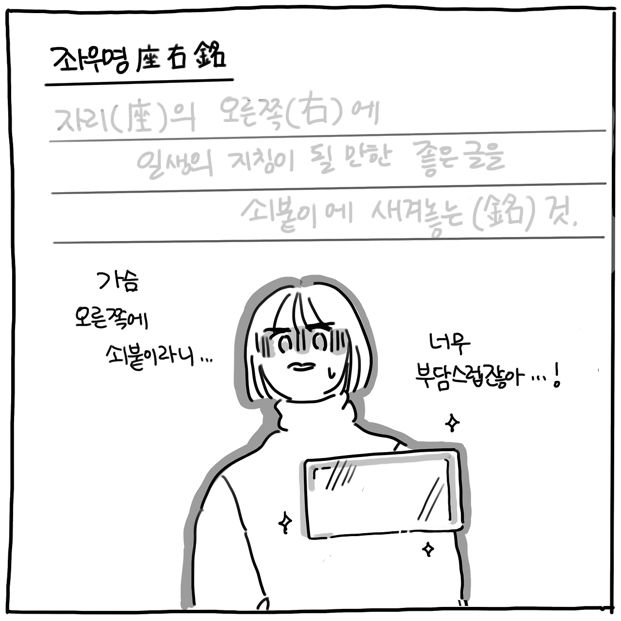 좌우명이라는 것이 자리의 오른쪽에 쇠붙이로 깊게 새겨놓고 생활의 지침으로 삼는 글이었다는 것을 아주 나중에서야 알았다. 지금 생각하면 참 너무한 숙제가 아니었나 싶다. 겨우 열 살 정도 살아본 사람에게 쇠붙이에 새길 정도의 결심을 찾아오라고 하다니. 아주 작은 것에도 쉽게 반응하고 쉽게 변하는 것이 당연한 나이인데, 그런 마음을 쇠붙이에 새겨서 오래도록 쳐다보게 하는 것은 좀 가혹한 것 같다.