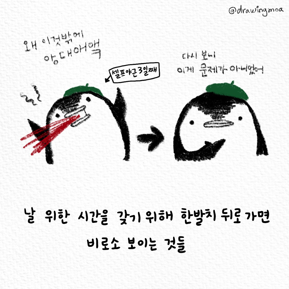깊게 파고들수록 나를 힘들게 하는 골칫거리들도 몇 발자국 멀리서 보면 내 우려와는 달리 작은 문제였다. 날 위한 시간을 갖기 위해 한 발치 뒤로 가면 비로소 보이는 것들.