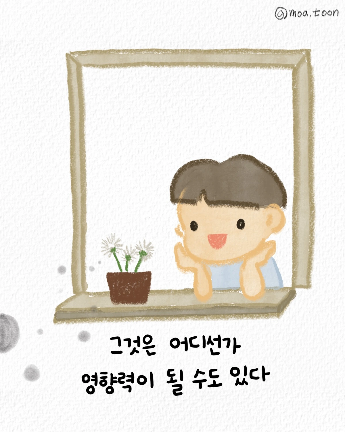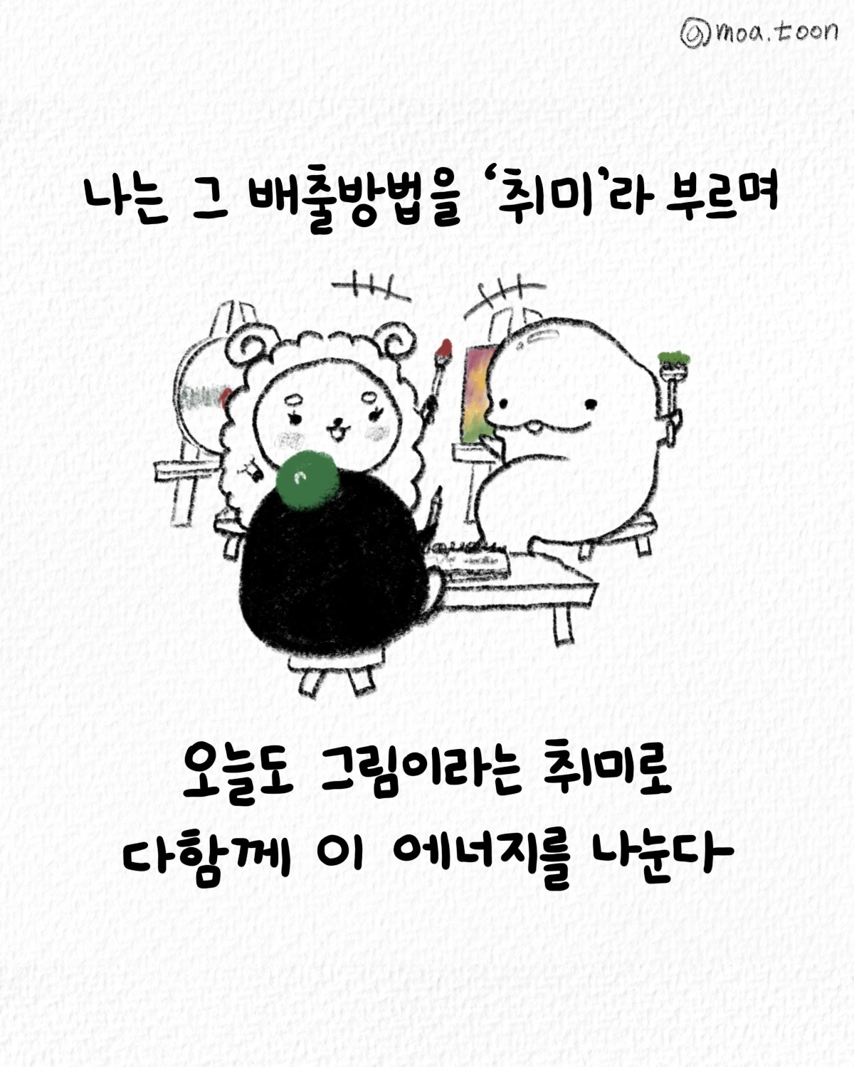 누구는 친구와의 대화를 통해 상대의 마음에 귀를 기울이고, 누구는 예쁜 마스킹 테이프를 사서 선물을 포장해 타인에게 기쁨을 주며, 누구는 글을 쓰고 만화를 만들어 공감대를 형성한다. 누구든 각자의 소소한 배출 방법이 있고 그것은 어디선가 영향력이 될 수 있다. 나는 그 배출 방법을 ‘취미’라 부르며 오늘도 그림이라는 취미로 이 에너지를 함께 나눈다.