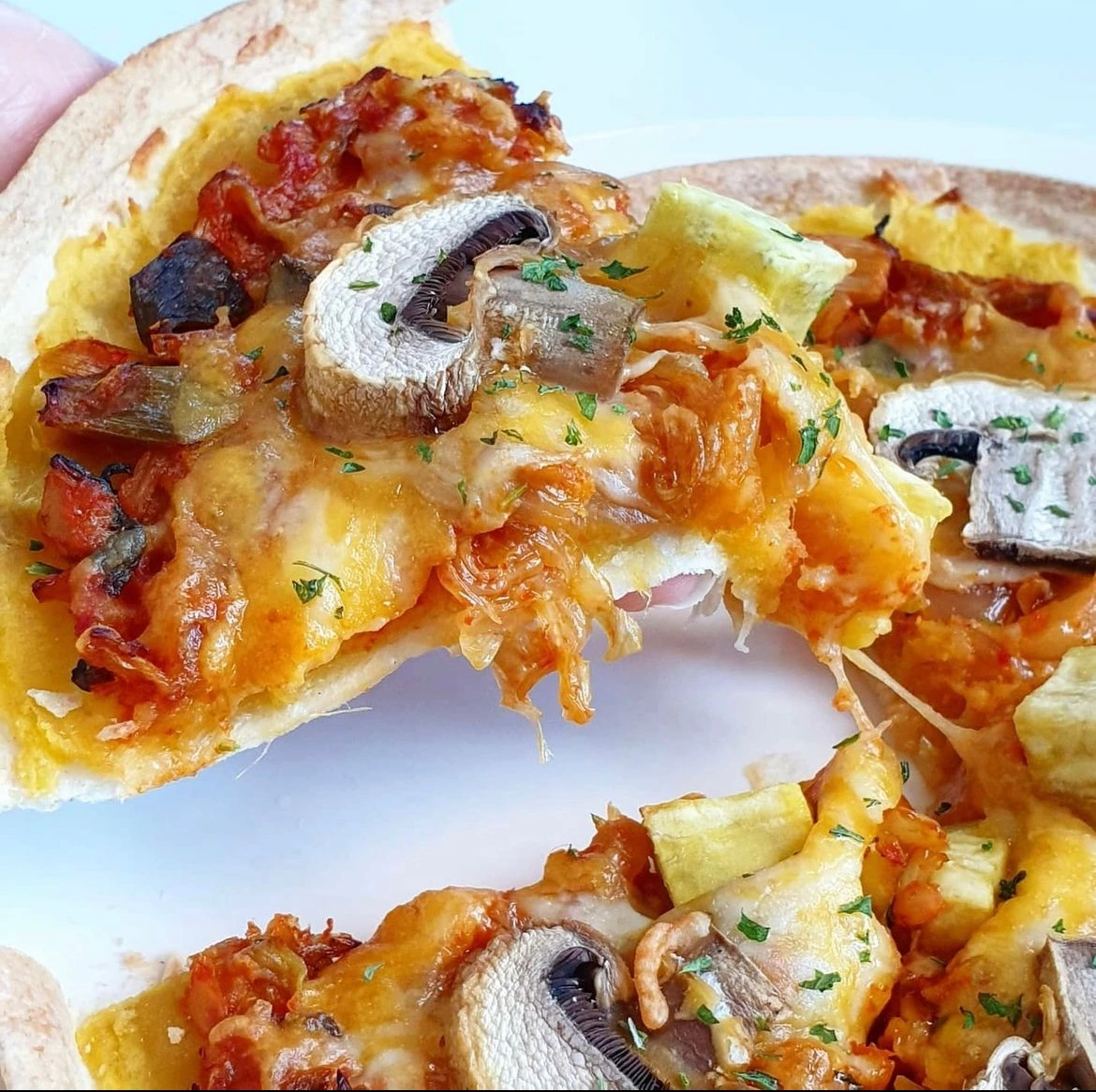 아래부터 또띠아-으깬 고구마-볶은 김치-치즈-토핑(양송이버섯, 고구마 등)을 순서대로 올립니다. 에어프라이어에 180도 10분 돌리면 완성!