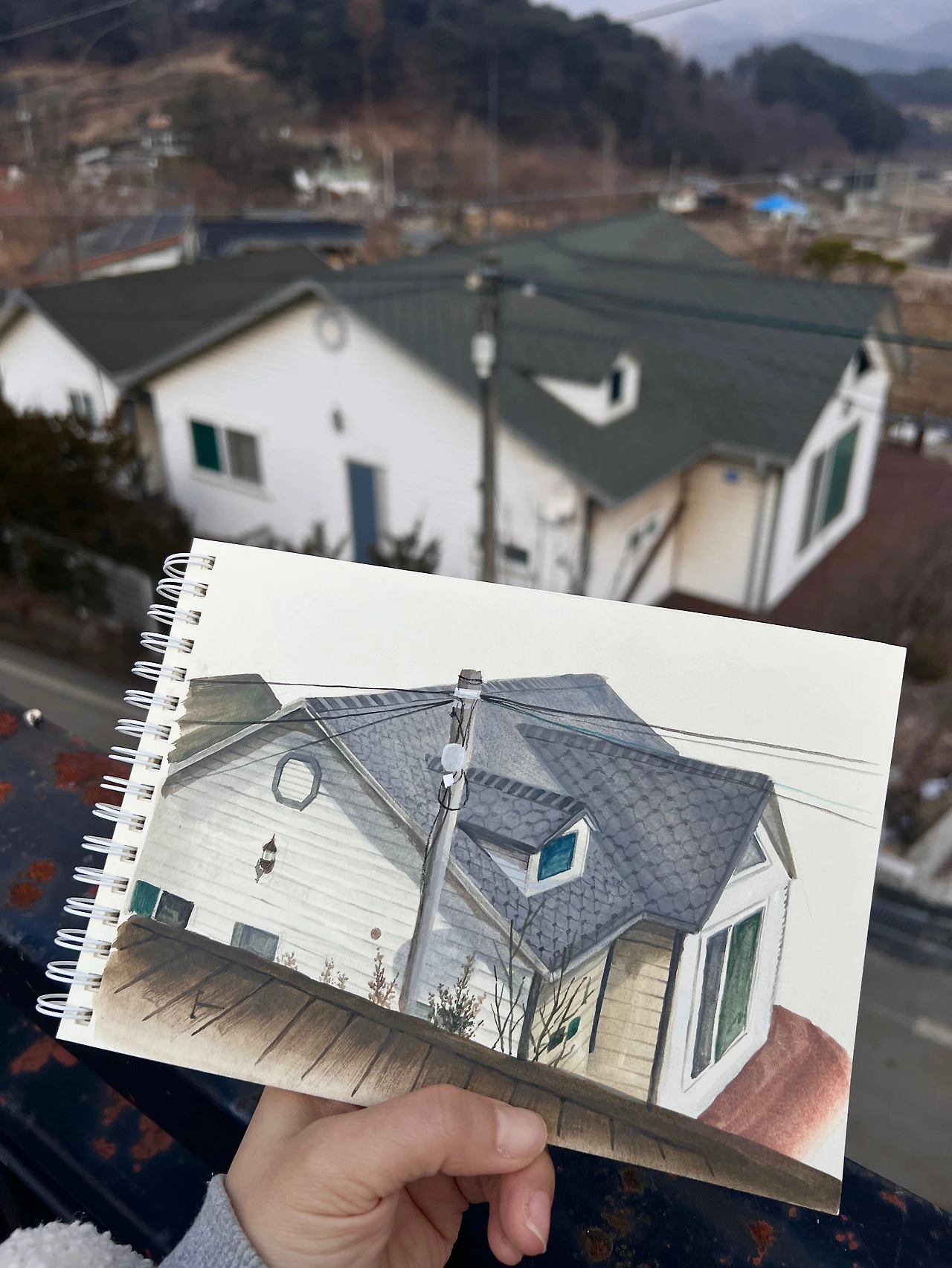 시골집에 도착하자마자 여과지를 꺼내 드립커피를 내렸다. 한 방울씩 떨어지는 커피가 포트를 채우는 동안 샤워를 하고 챙겨 온 잠옷을 입었다. 따뜻한 실내에서 아이패드로 끄적이는 편리한 낭만 대신 두툼한 수면 양말, 담요와 미술 도구를 한 아름 챙겨 밖으로 나왔다. 마침 불편하기 딱 좋은 날씨다. 커피잔에 가득 채운 얼음이 후회되지 않을 만큼 바람 한점 없는. 스마트폰을 집어넣고 드로잉북을 꺼냈다. 휴대폰이 없으니 사진도 없다. 담요를 뒤집어쓰고 음악 대신 새소리를 들으며 그림에 집중했던 2시간.