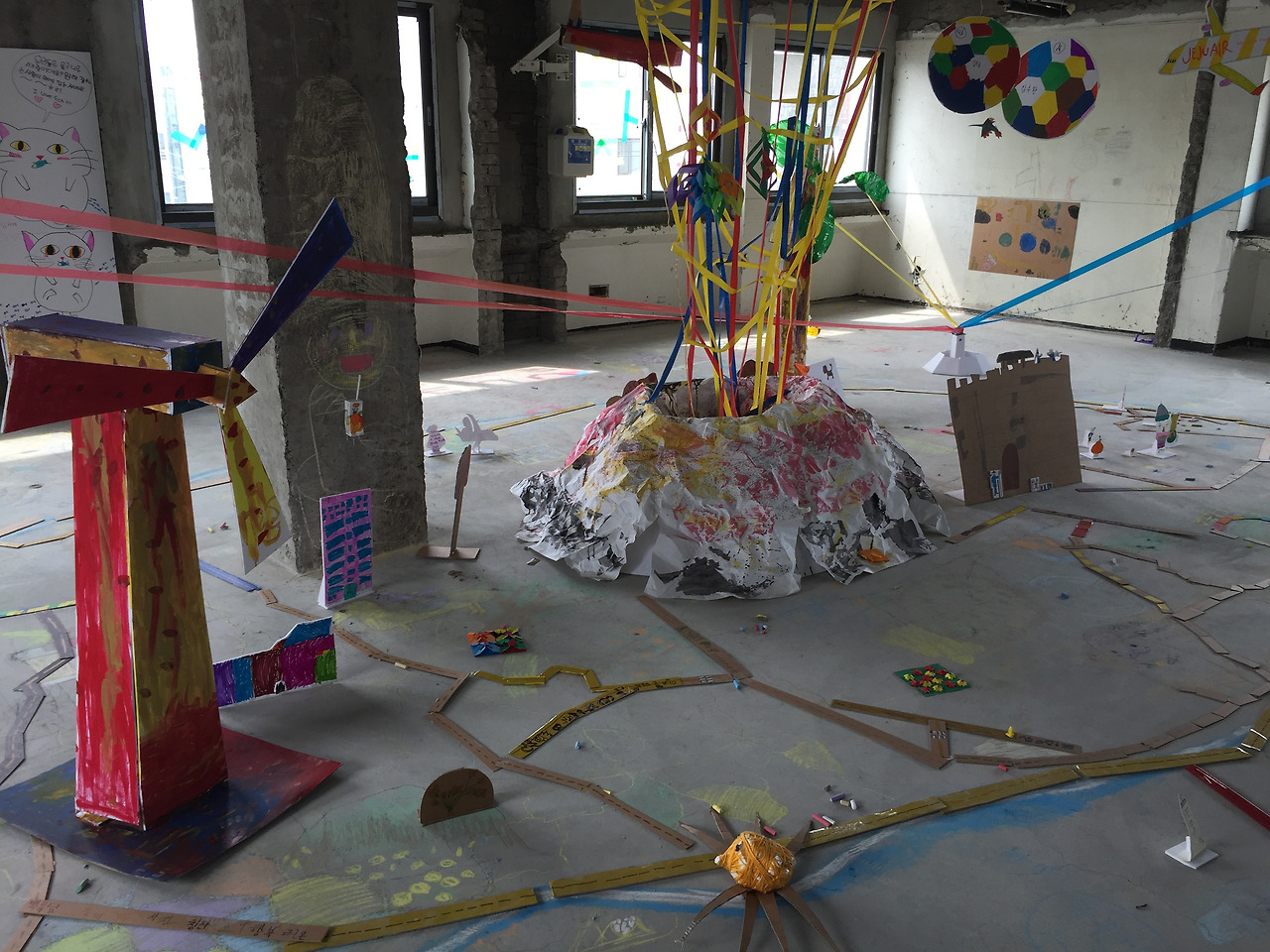 [3층 서쪽] 제주섬과 한라산을 형상화한 아이들의 멋진 집단 창작물이 있었습니다. 제주에서 태어나 자란 아이들에게는 제주가 '땅의 끝과 끝이 있는 세계 전체'였을 수 있겠지요. 아이들이 그린 지도와 조형물의 크기의 비율이 눈에 띕니다. 풍력발전기(저는 풍차라고 부르고 싶습니다)가 상당히 크게 표현되어 있습니다. 한라산은 용암을 형형색색 분출하고 있구요(아이들의 창작에너지의 분출이 아닐까요). 바다에서는 용출수가 건물에 드리워진 폐파이프를 타고 오르고 있었습니다. 어른들은 아이들의 이런 마음의 배분을 알까요? 제주시내는 작게 표현되어 있고 애월과 조천이 거의 맞닿아 있었습니다. 둘러산 섬들이 잘 표현되어 있었구요. 제주의 미래를 만들어갈 아이들의 마음속에 어떤 그림이 있는지 제주의 부모님들과 이주민들이 이 작품을 통해 느낄 수 있으면 좋겠다는 생각이 들었습니다. 그리고, 아이들은 이 작업을 통해 세계를 자신의 것으로 만들 수 있었을 것입니다.
