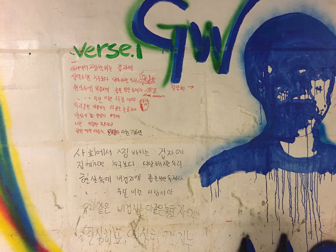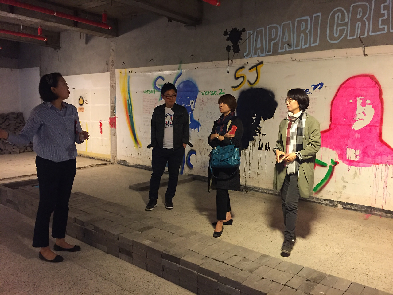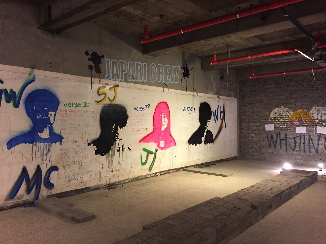 [지하] 이곳에서 제주 청소년들과 예술가가 함께 한 예술 워크샵 '제주를 꼴라주하다'의 결과물을 보고 과정에 대한 이야기를 들었습니다. 구제주대병원의 낡은 지하 콘크리트 공간이 아이들에게는 자유로움을 발산할 수 있는 예술적 해방구가 되었음을 볼 수 있었습니다. 아이들이 써내려간 랩은 저절로 라임이 읽혀지더군요. 제주의 청소년들의 마음을 읽을 수 있었습니다. 섬에서 태어나 괸당(친척을 뜻하는 제주어로 최근에는 학연, 지연까지 확장)에 둘러싸여 자라나면서 자유로운 해방 아지트에 대한 욕구가 크지 않았을까 싶네요. 그래서 그런지 예술 워크샵이 제주 아이들은 더 즐겁게 몰입하여 참여했고 분출된게 아닐까요. 프로그램을 진행한 예술가들도 육지보다 더 강한 에너지를 느꼈고 많이 배웠다고 합니다. 이 워크샵을 경험한 아이들 중에 바스키아처럼 엄청난 아티스트가 나올 수도 있지 않을까 생각해봤습니다.